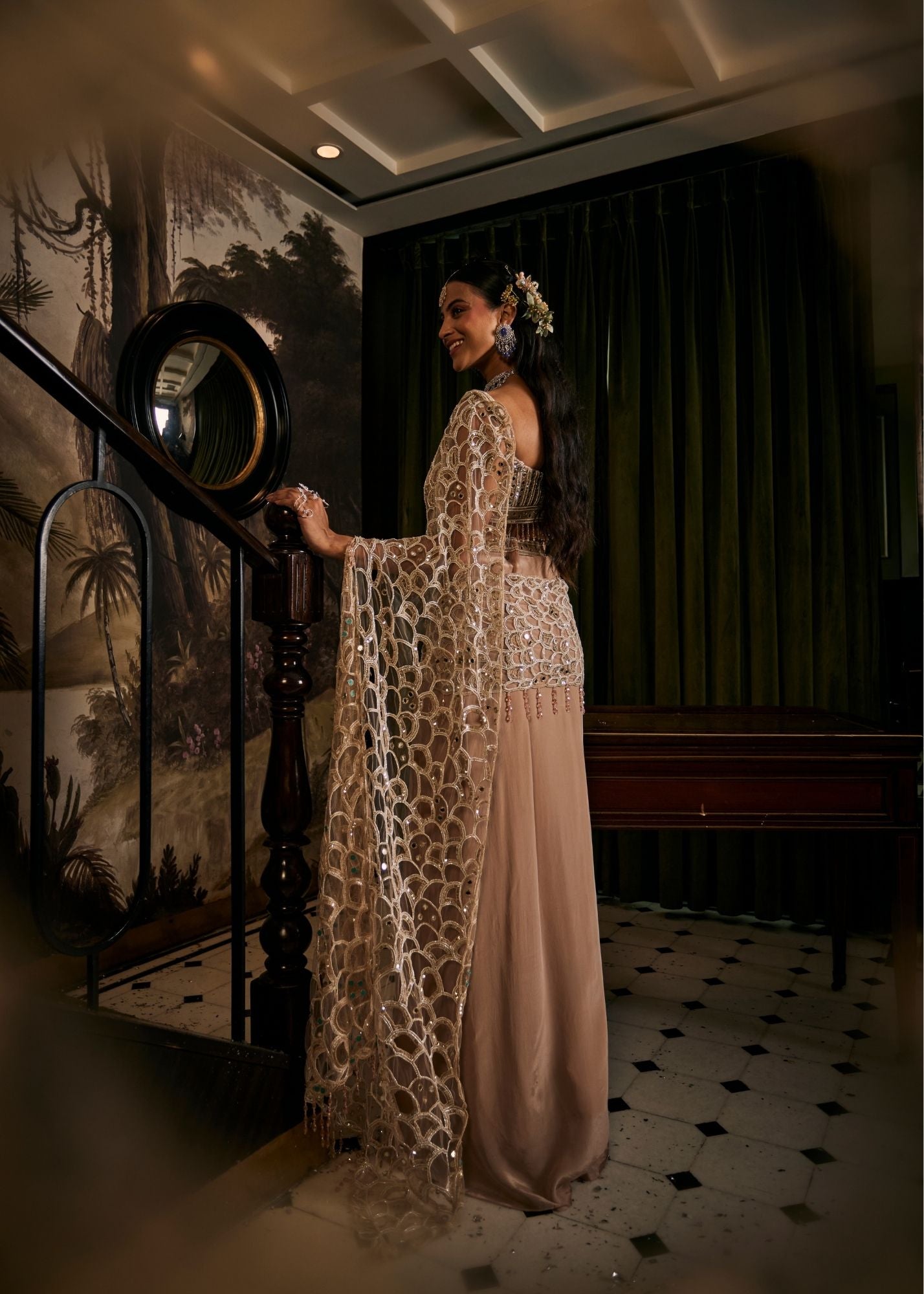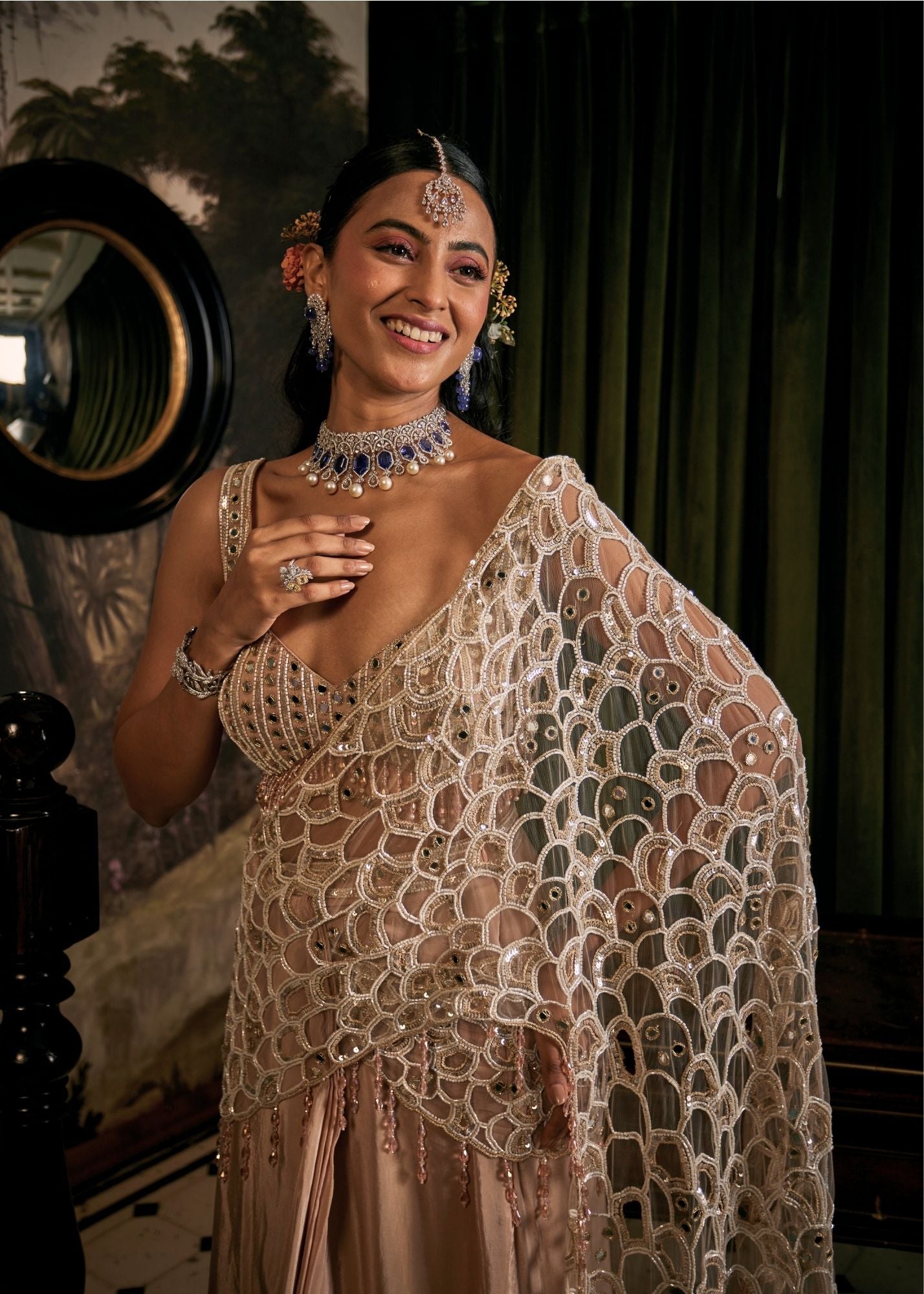 Blush pink holds a kind of romance that words rarely capture ~ it’s the color of stolen glances and unspoken promises. This contemporary saree set, with its sweetheart neckline and sleeveless ease, drapes like a whisper of confidence. Hand embroidery glimmers across net and crepe, catching the light as if it were joy itself. For the bride and her closest ones, it’s not just an ensemble, but a memory woven into fabric - soft, radiant, and endlessly captivating.