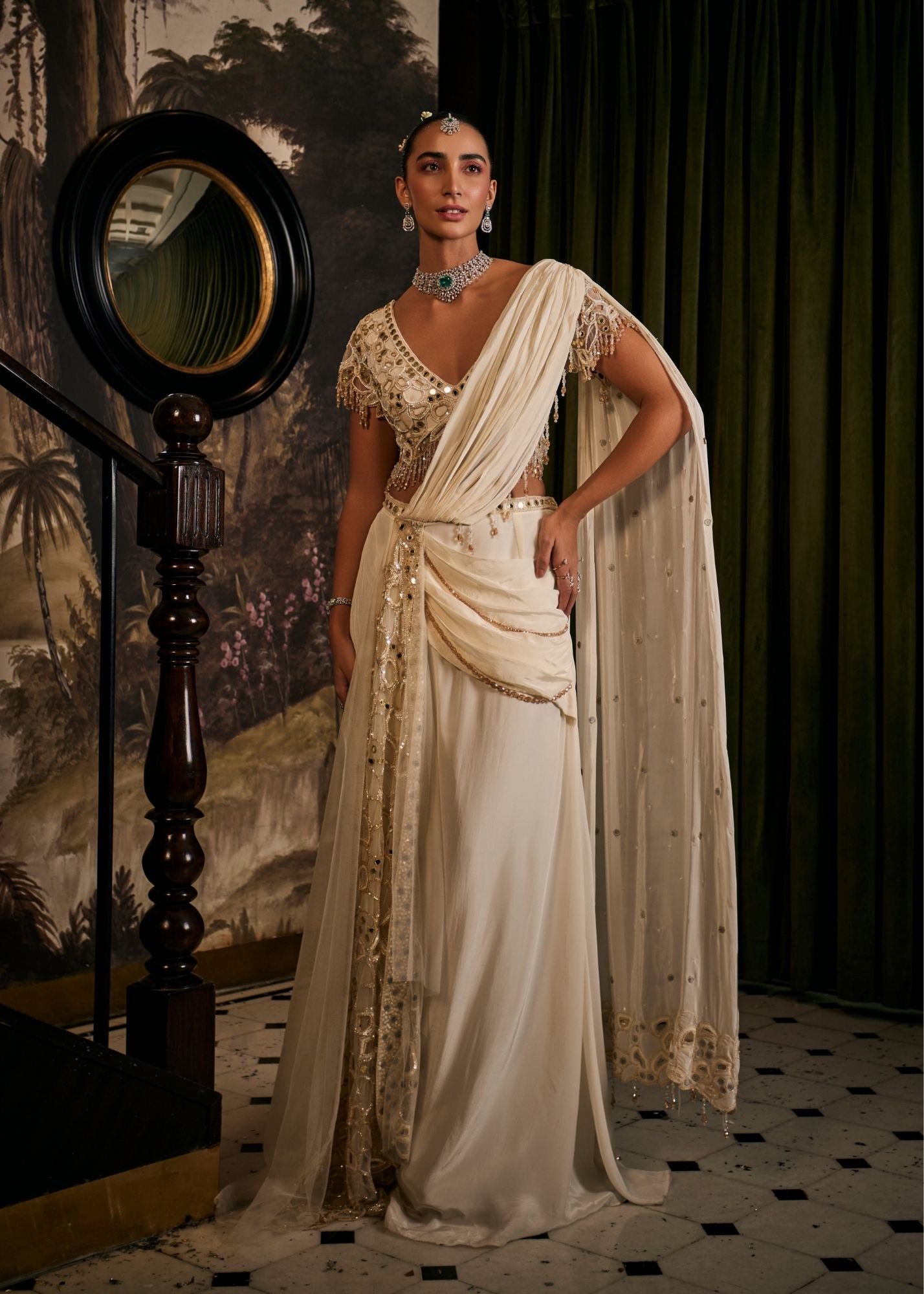 Ivory becomes a canvas of quiet drama in this contemporary saree set. The cape sleeves sweep around you, not just as fabric, but as movement - like the air shifting when the bride enters the room. Every hand-embroidered detail feels intentional, crafted to catch the eye in fleeting glimmers. With its net and crepe base, it isn’t a saree you simply wear, it’s one that carries you forward, into a celebration where tradition and modernity hold hands.