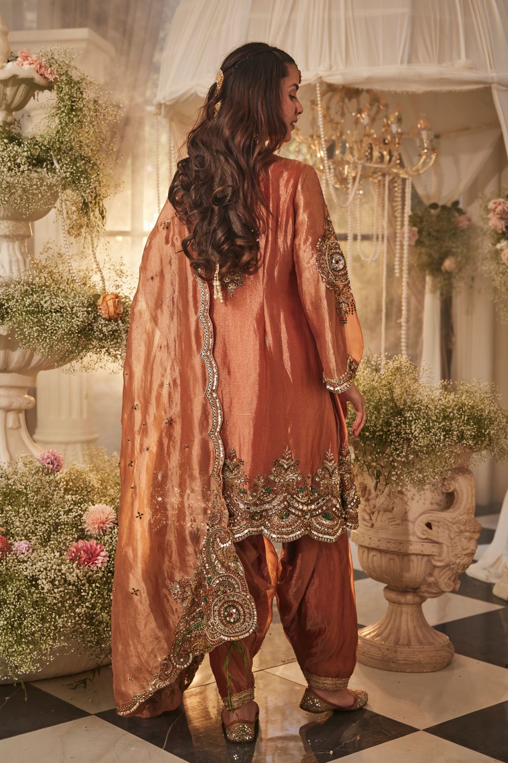 This coral-rust suit set feels like the soft glow of a celebration just beginning. The round V neckline outlined with hand-placed jewel stones, the bell sleeves moving with a gentle flair, and the tissue kurta catching light in warm, luminous ripples. Paired with tailored pants and a dupatta that drapes with effortless ease. A quiet harmony of grace, warmth, and togetherness woven into every detail.