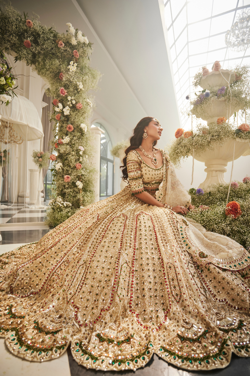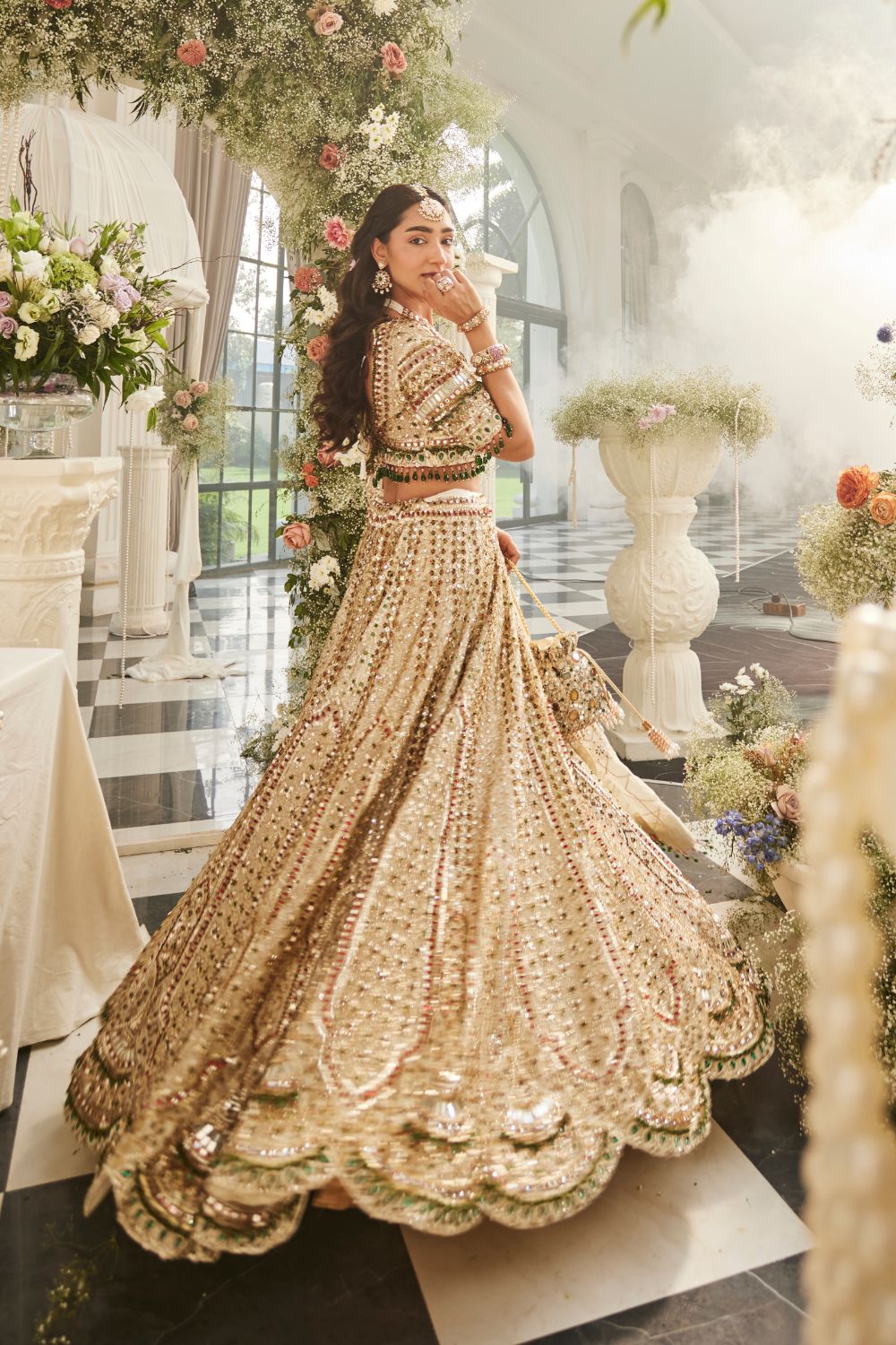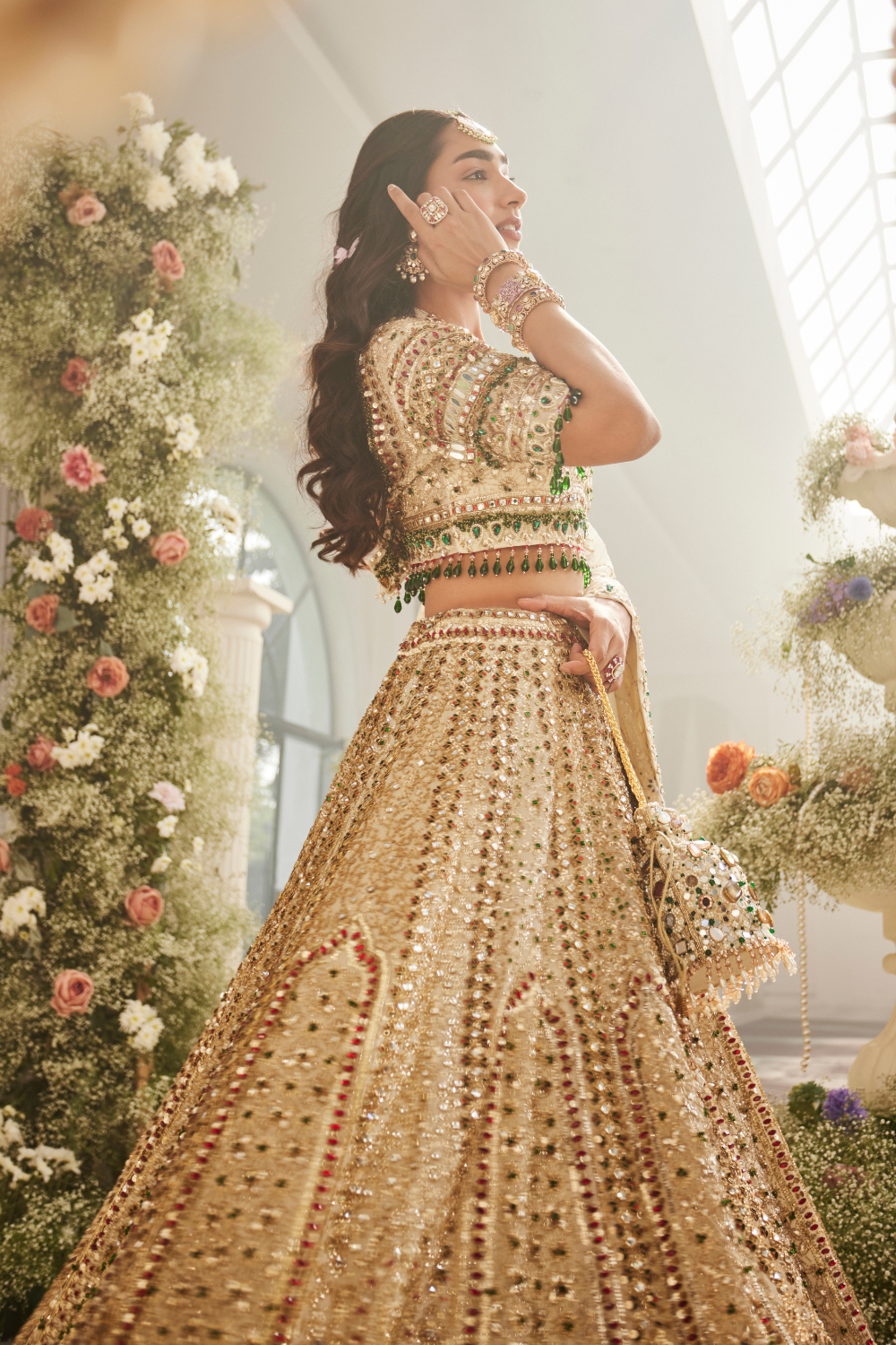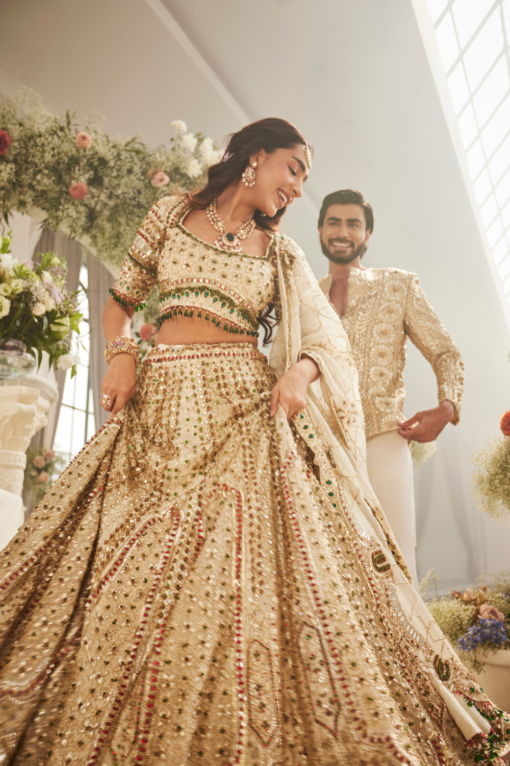 This light-gold lehenga set glows with a softness that feels almost celestial ~ the round-with-corner blouse shimmering with hand-set jewel stones, its elbow sleeves giving it a poised, timeless charm. The tissue lehenga moves with a quiet, luminous sway, catching light in gentle waves, while the dupatta rests around her like a warm breath of anticipation. It’s the kind of ensemble that turns a moment into a memory, a radiant chapter shared between the bride and her closest circle, wrapped in elegance, warmth, and the tender glow of celebration.