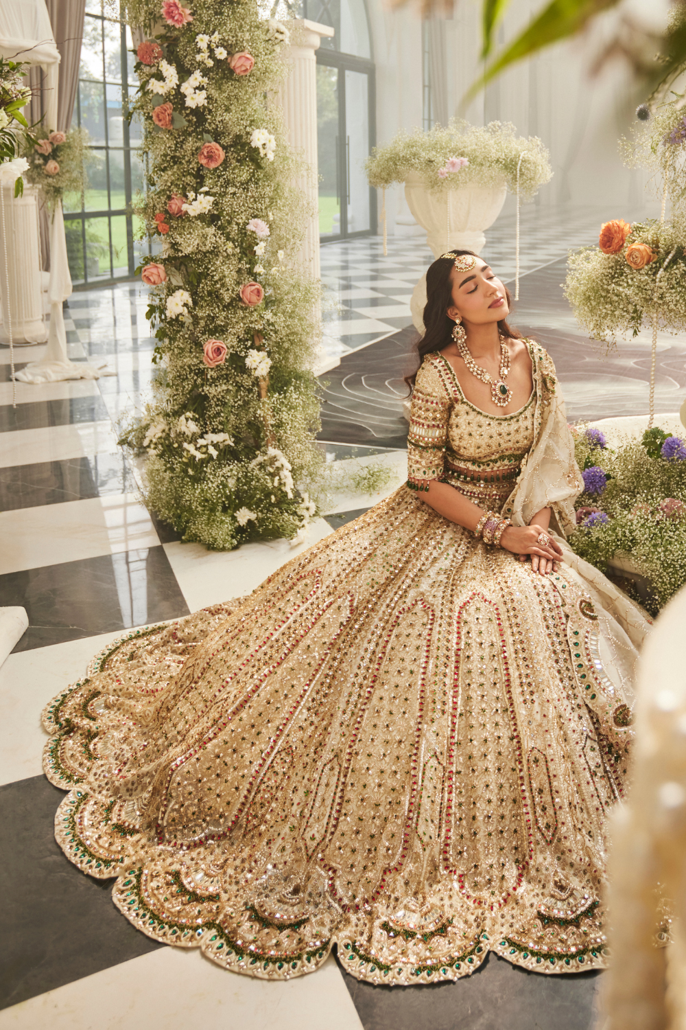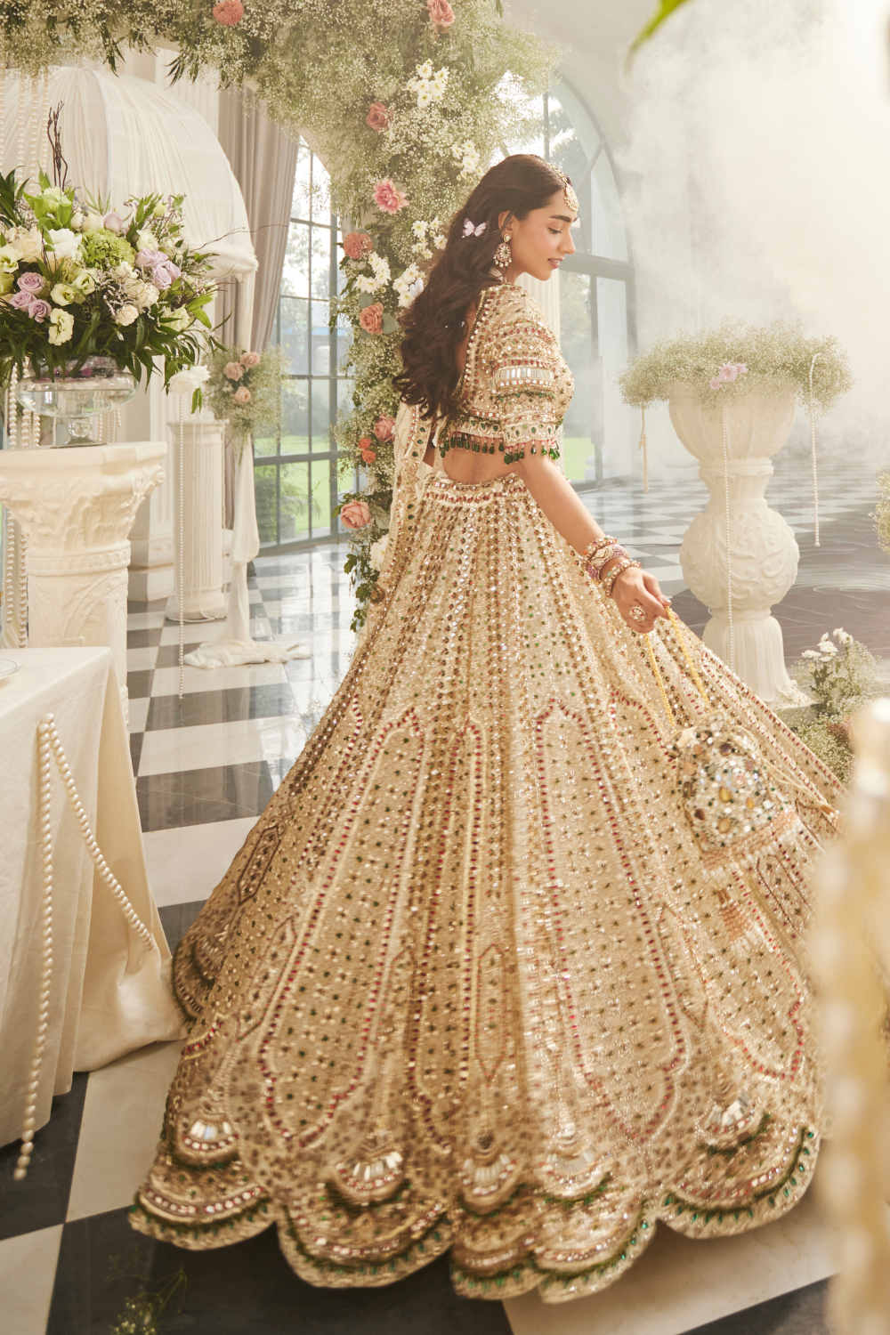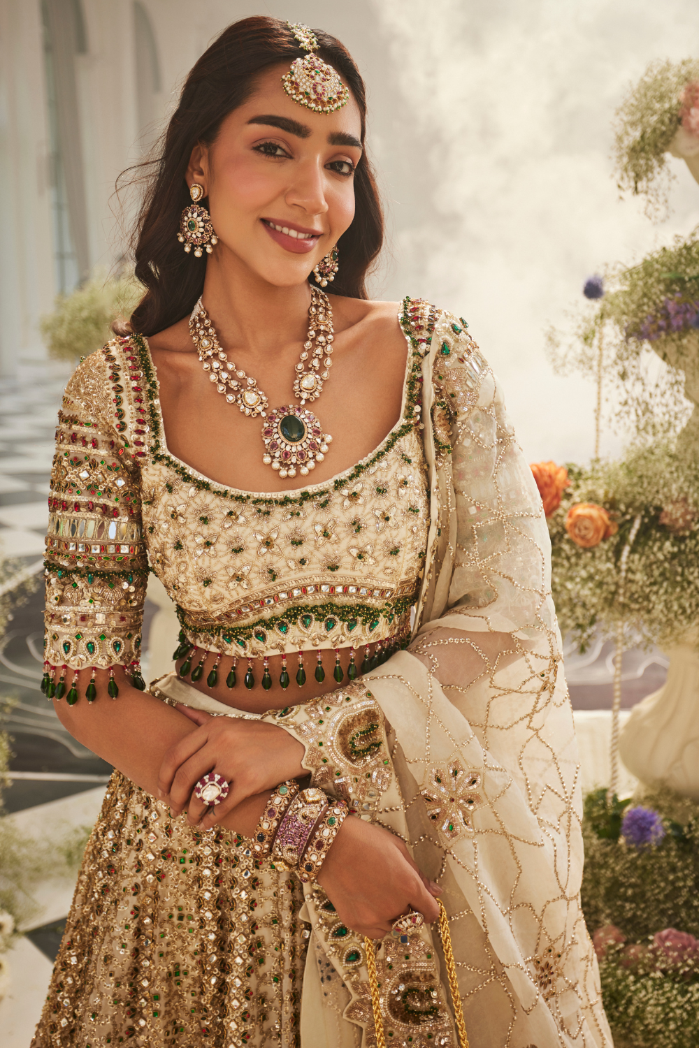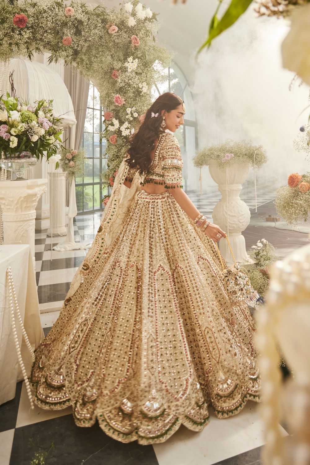 This light-gold lehenga set glows with a softness that feels almost celestial ~ the round-with-corner blouse shimmering with hand-set jewel stones, its elbow sleeves giving it a poised, timeless charm. The tissue lehenga moves with a quiet, luminous sway, catching light in gentle waves, while the dupatta rests around her like a warm breath of anticipation. It’s the kind of ensemble that turns a moment into a memory, a radiant chapter shared between the bride and her closest circle, wrapped in elegance, warmth, and the tender glow of celebration.
