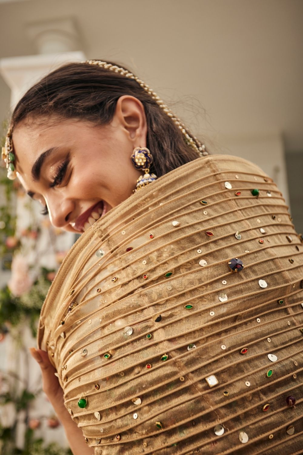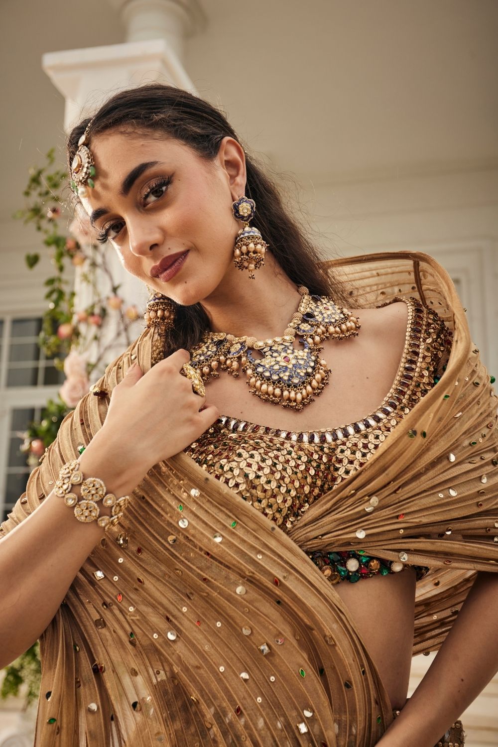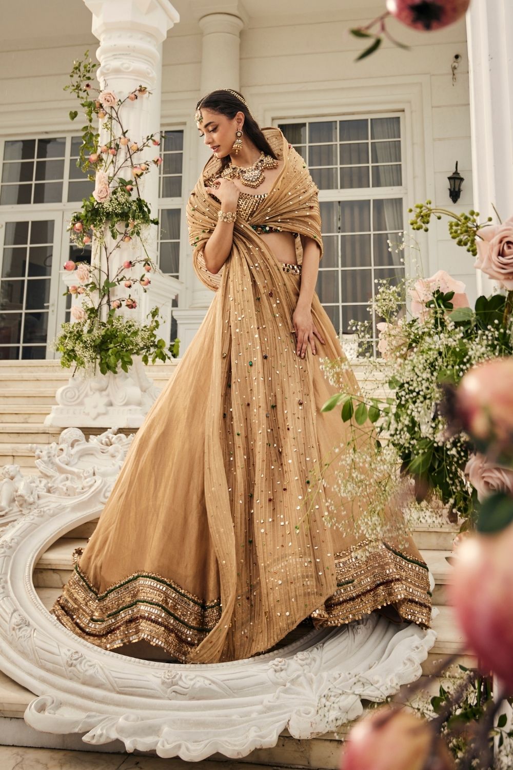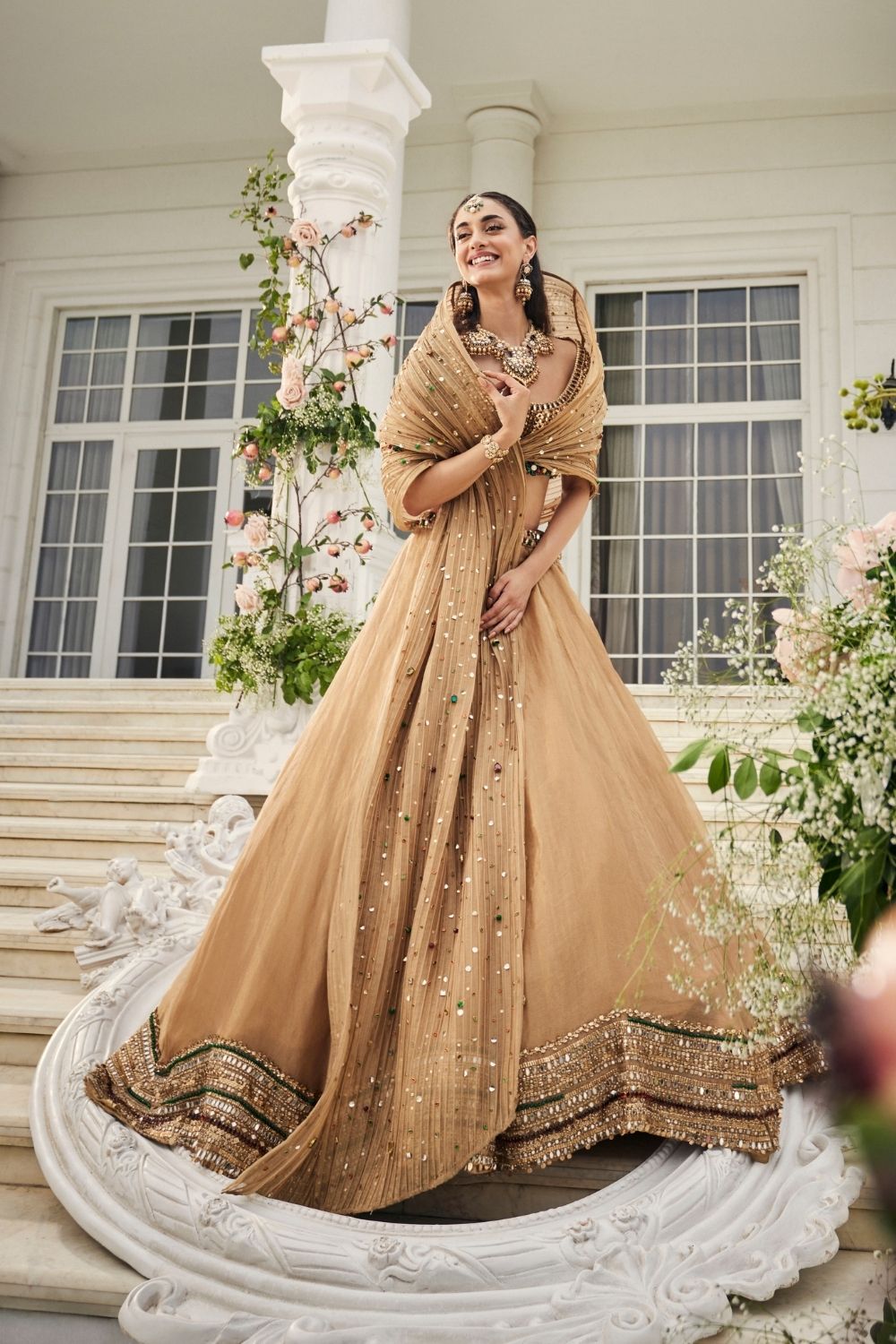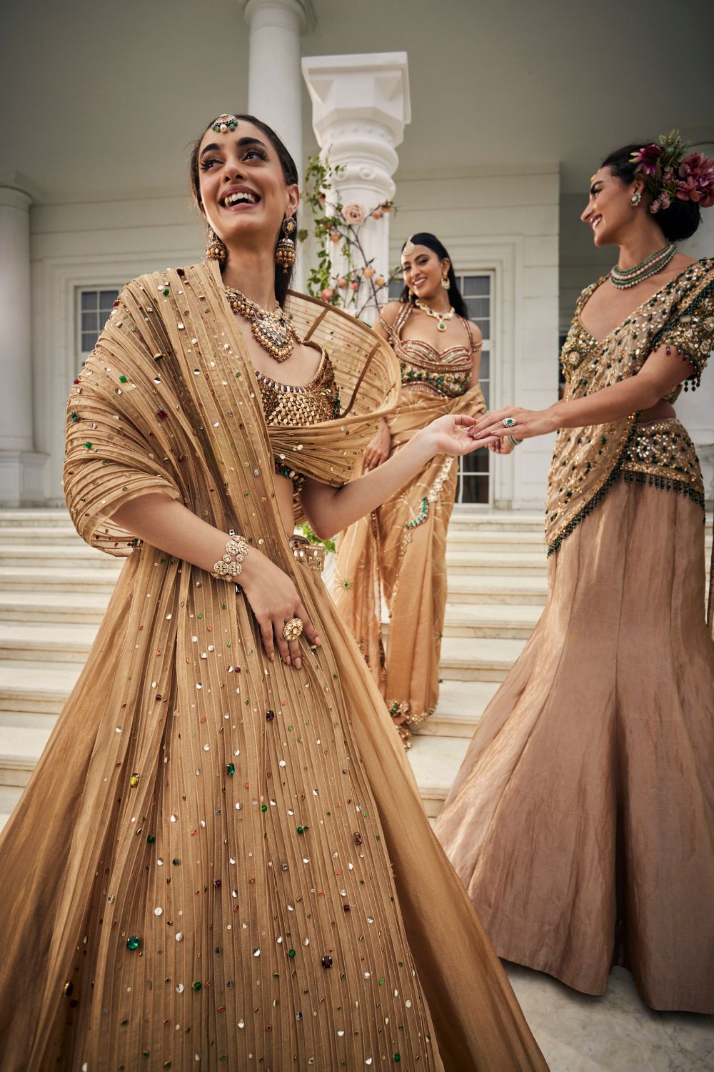There are moments when a bride does not just wear an outfit, she commands a presence. This beauty is woven for that very moment. In luminous gold tissue, the lehenga glimmers with hand-embellished stones, each scarlet and emerald accent catching the light like fire against dusk. The round neckline lends simplicity, while flowing cape sleeves add a touch of drama, as though the garment itself were a crown. This is a look made not only for the bride’s walk into tradition, but for the quiet envy it leaves behind-a story of radiance that lingers long after the celebration ends.
