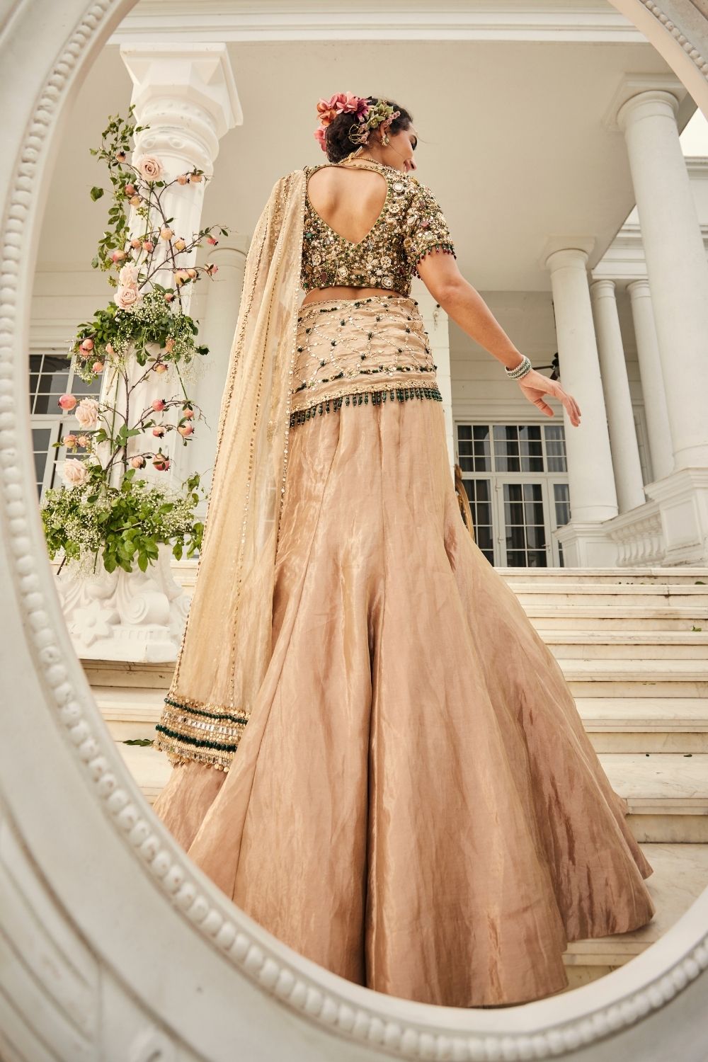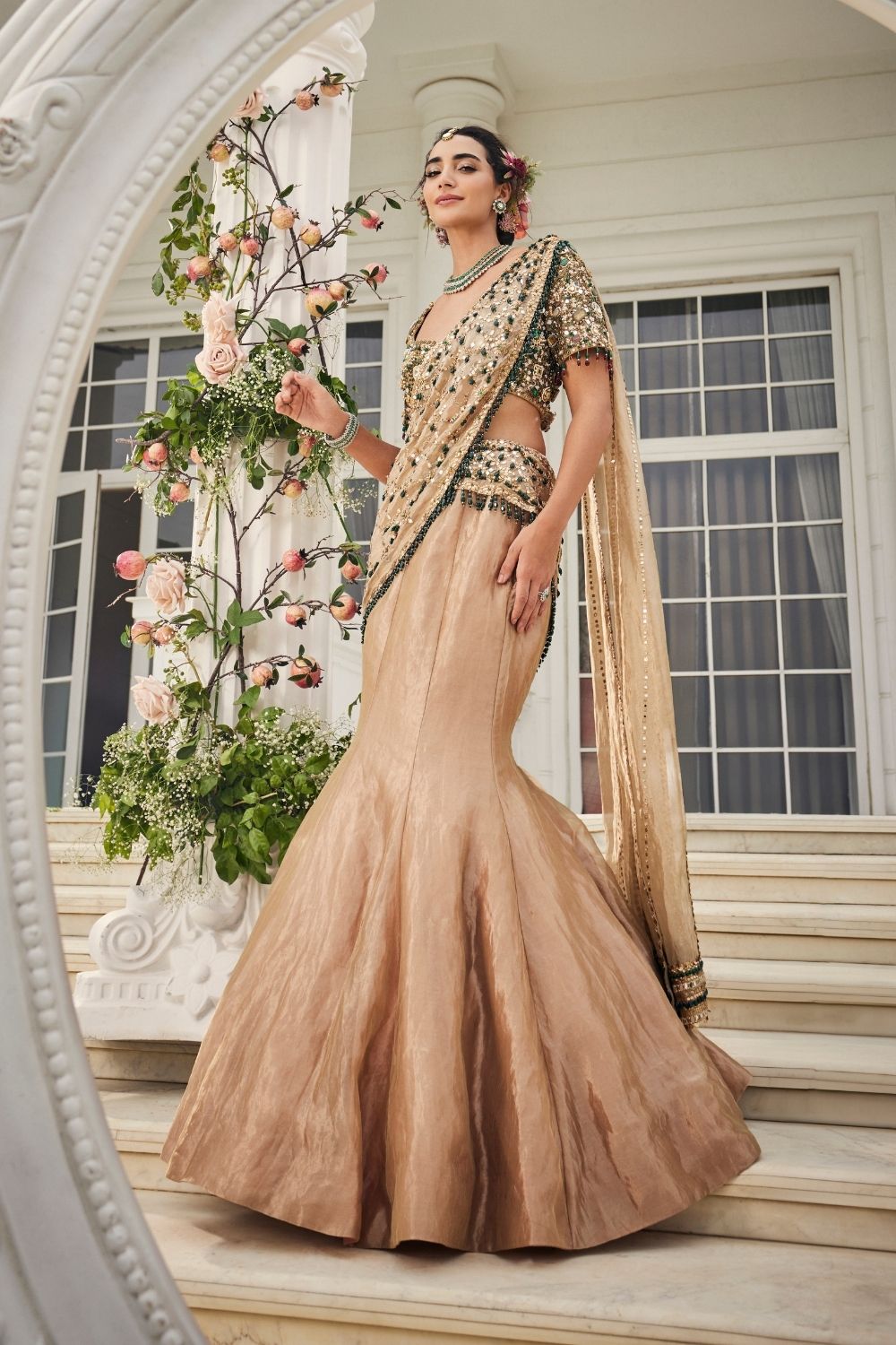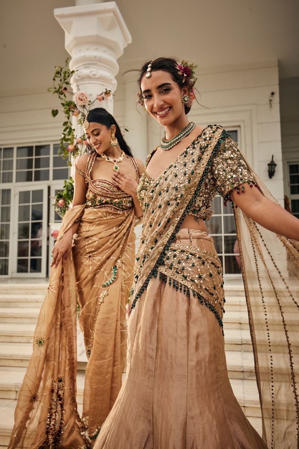 Shaped to celebrate every curve, this fish-cut drape set is a vision of modern grace rooted in tradition. In the shimmer of gold tissue, the silhouette flows like liquid light, hand-embellished with scarlet and emerald jewels that sparkle like treasures upon water. The sweetheart neckline and elbow sleeves lend softness to its sculpted form, balancing strength with romance. With every step, the drape moves as though it were alive, carrying the bride into her moment of radiance. More than a garment, it is a story of elegance that embraces both heritage and allure.