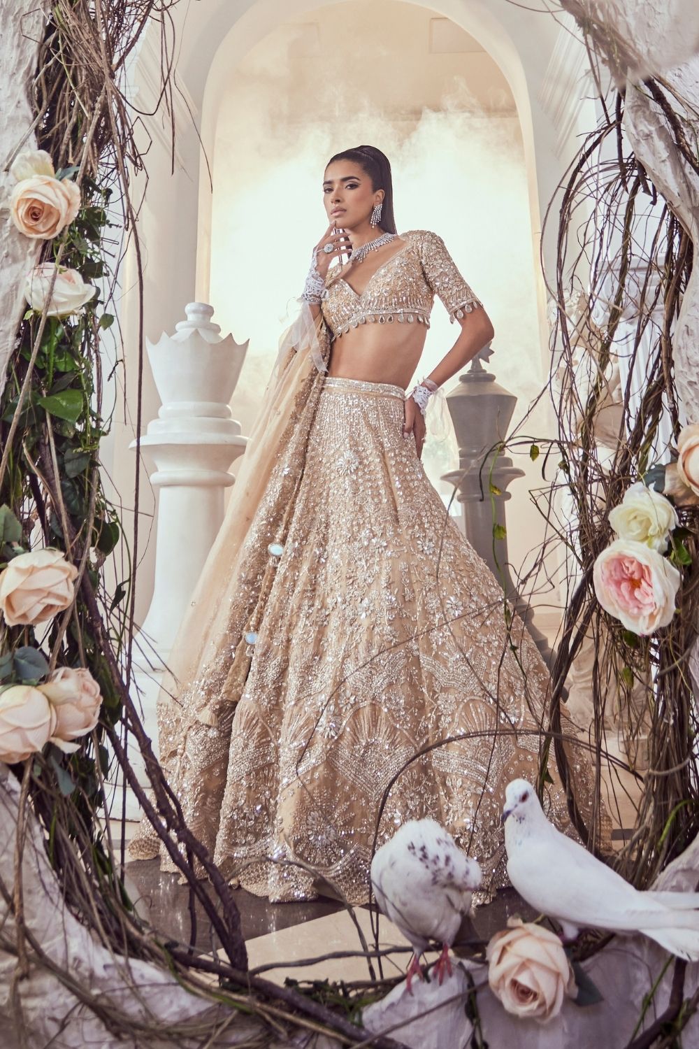 Like liquid gold woven into fabric, this bridal lehenga shimmers with an ethereal glow with mirrors making their mark on it. The sweetheart neckline and delicately adorned elbow sleeves evoke a timeless style, while with the luminous tissue fabric, the silhouette glows effortlessly, rich in grandeur. This is for the bride who dreams in gold—radiant, regal, and stepping into forever like a vision from a fairytale.