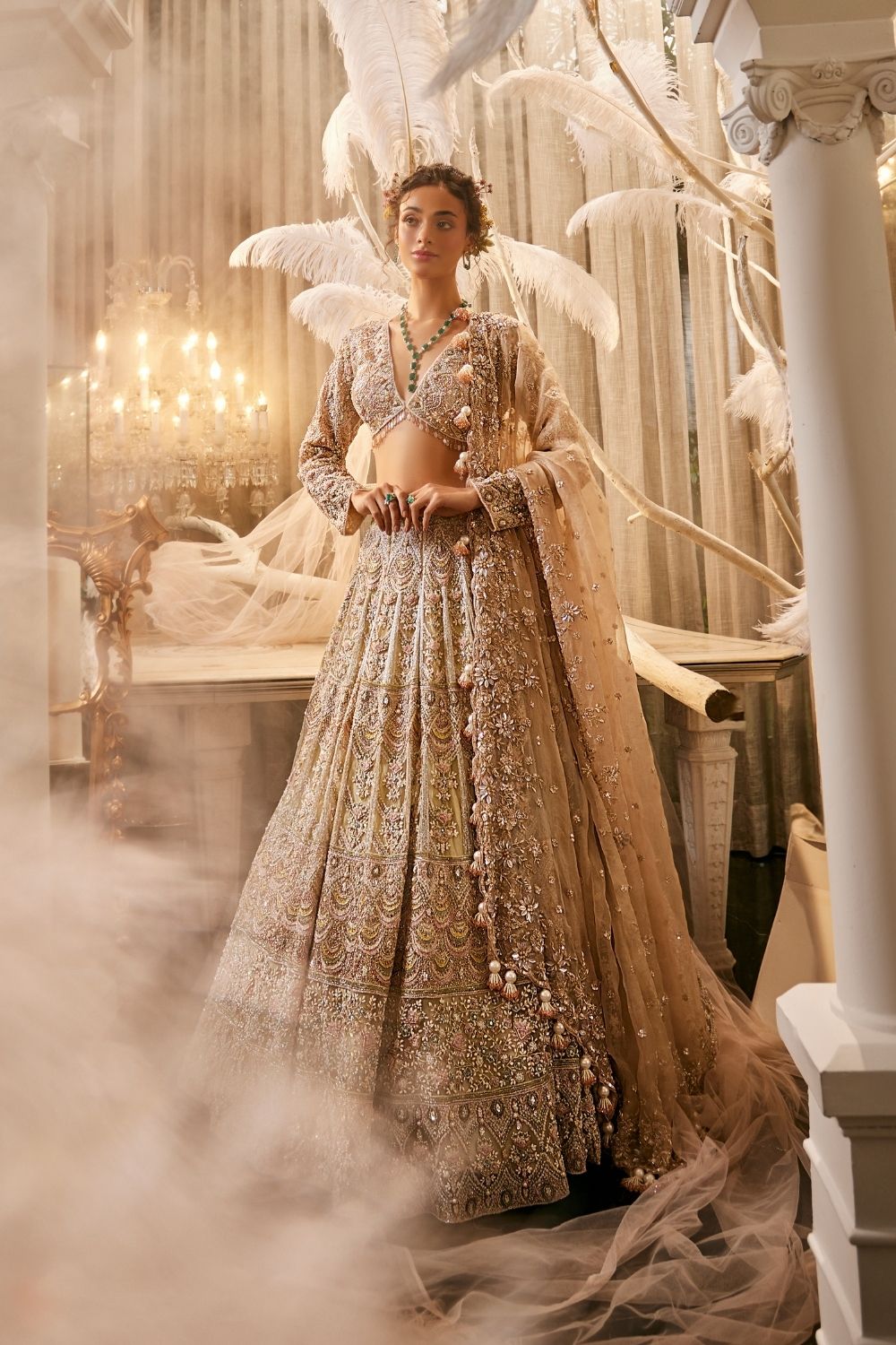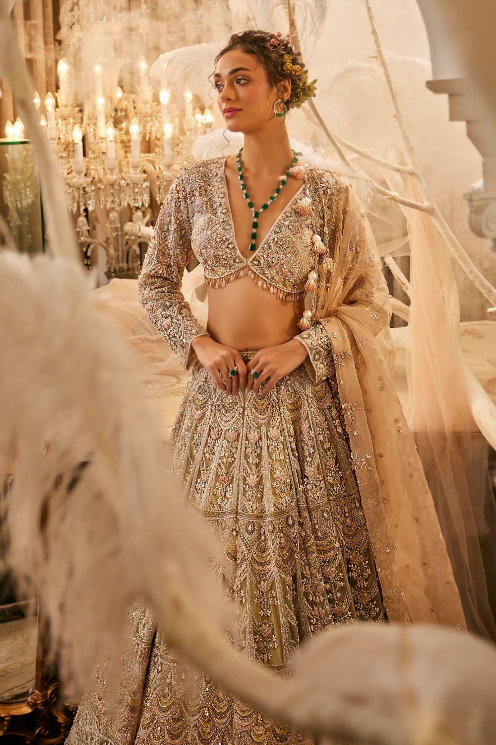 The room is bathed in a soft, refreshing glow as the mint green lehenga sways, the design both striking and delicate, creating an aura of enchantment that seems to shimmer with every step. The deep V neckline, paired with full sleeves and the dupatta, with its matching embellishments, draped gracefully, add a fluid finish to this captivating look. Ideal for the bride or bridesmaid who wants to stand out, perfect for weddings, sangeet, or any celebration where beauty and grace shine through.