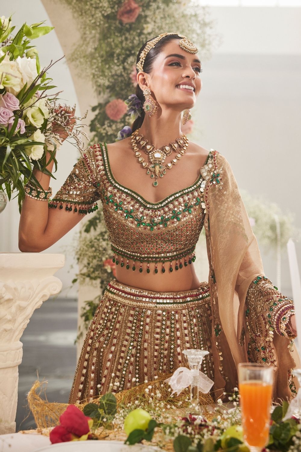 The wide-round neckline gives this gold lehenga set a beautifully open, graceful frame. Paired with elegant elbow sleeves, the blouse feels balanced and refined, while the tissue lehenga adds a gentle, glimmering sway with every step. The dupatta drapes in with light, effortless ease, tying the look together in a warm golden glow. Altogether, it creates a silhouette that feels inviting, radiant, and quietly celebratory.
