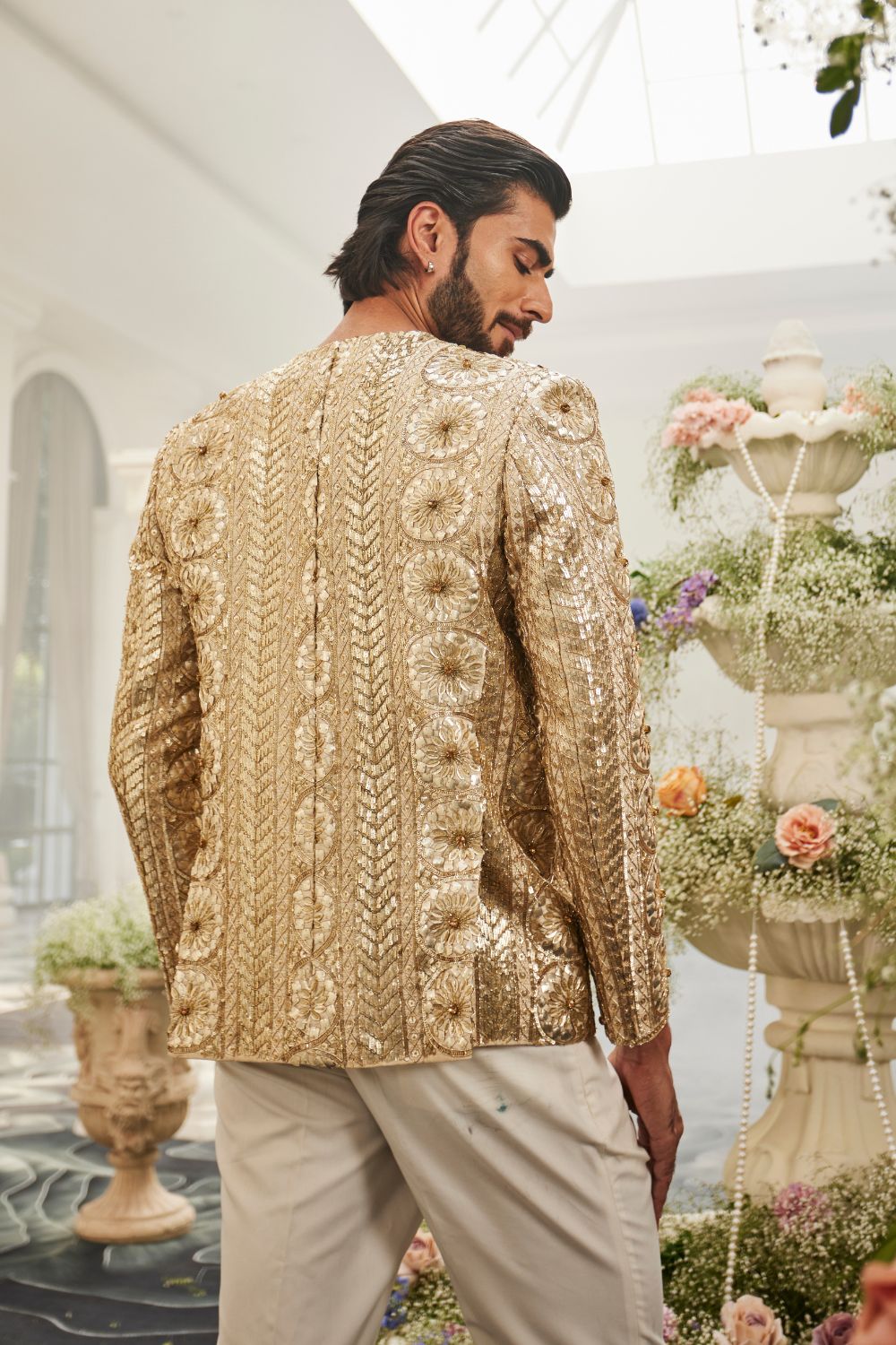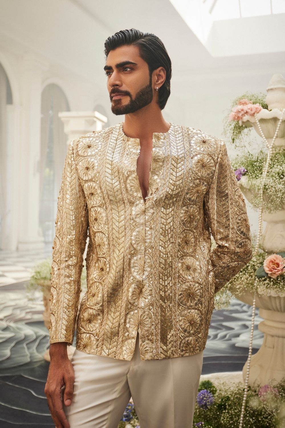 Crafted in luxurious raw silk, this gold kurta set captures the quiet opulence of tradition refined. The stand collar and full sleeves lend it a stately grace, while the hand-embellished details shimmer with understated grandeur. Designed for moments that call for presence and poise, it’s a timeless piece that speaks of heritage ~ reimagined in gold.
