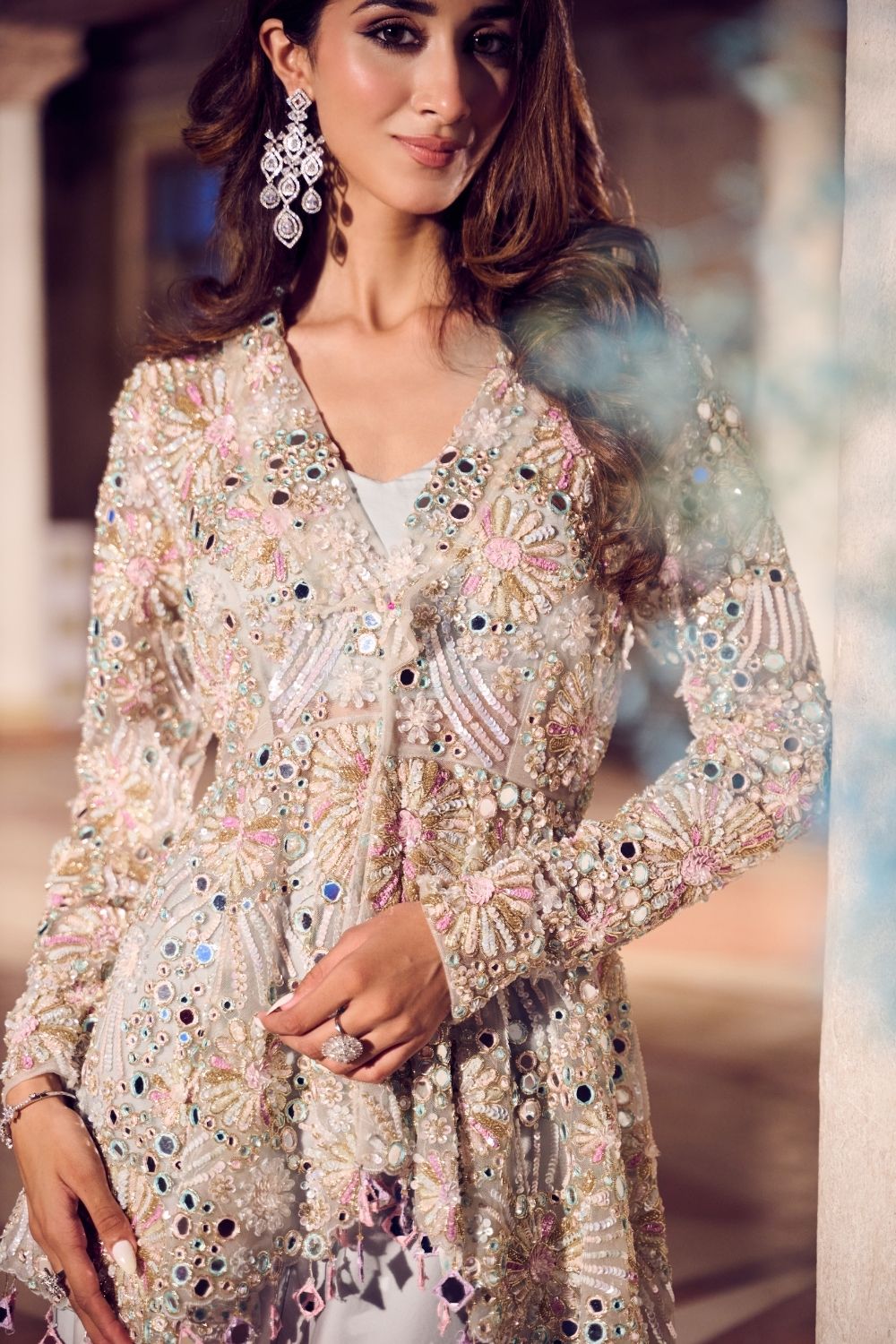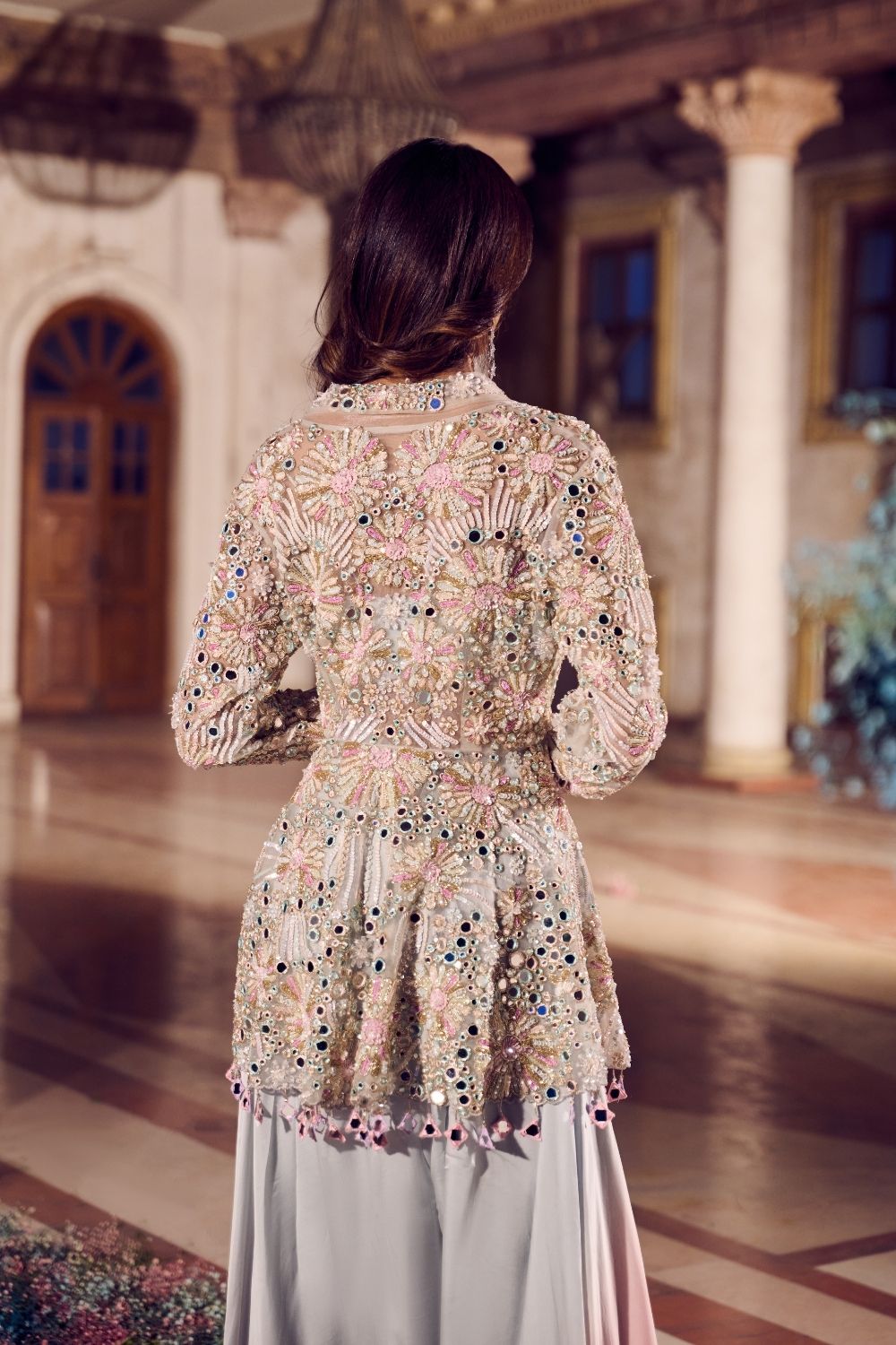 As sunlight filters through the castle’s arches, she steps into view, a modern vision wrapped in tradition. The powder blue and rose gold ensemble weaves together a V-neck bustier, delicately embellished while catching every glint of the golden hour. The peplum flares beautifully, paired effortlessly with billowing flared pants that add a playful edge. With full sleeves adding a touch of refinement, this set is perfect for a mehendi function or an intimate engagement