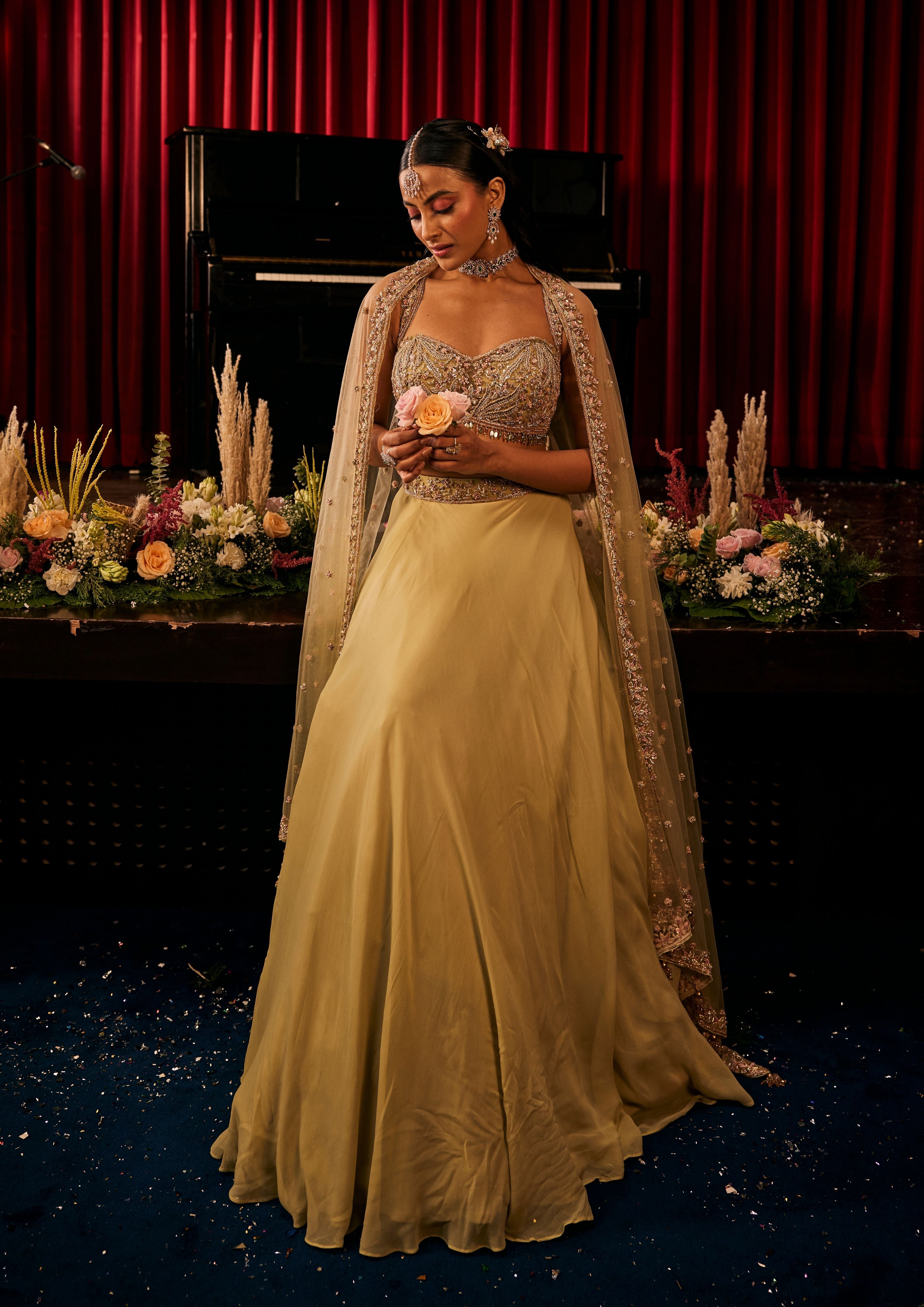 This mint green lehenga was made for the kind of joy that has you rushing towards the dance floor, hands raised and body swaying. Its sleeveless silhouette and sweetheart neckline carry an effortless charm, while the flow of net and georgette moves freely with every twirl. Hand embroidery glimmers in the light, as if celebrating right along with you. An ensemble that doesn’t just join the party but becomes it.