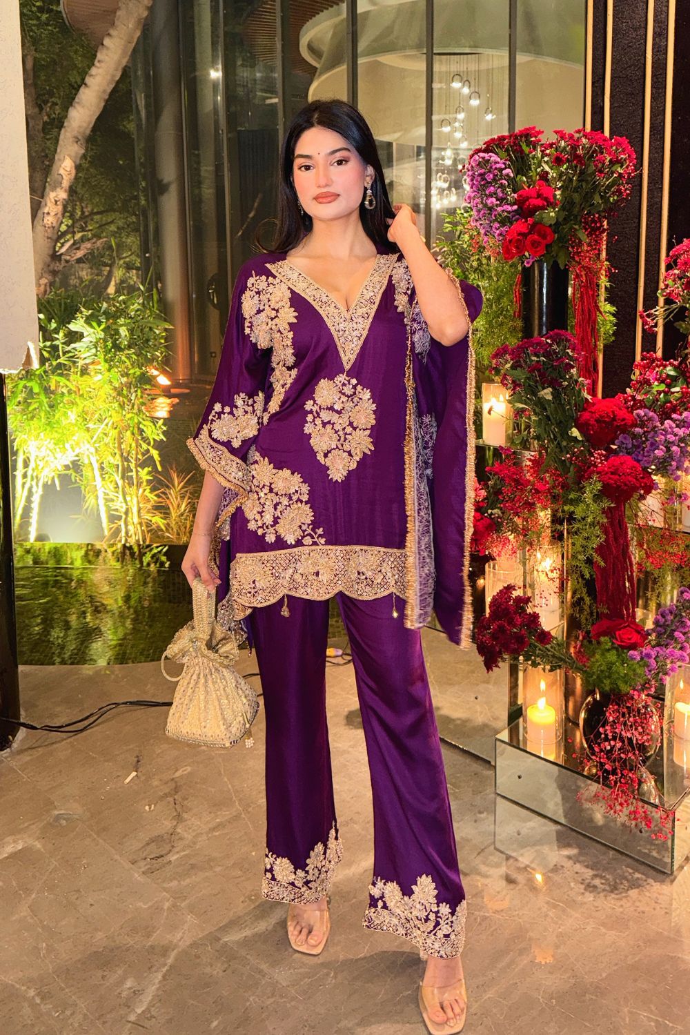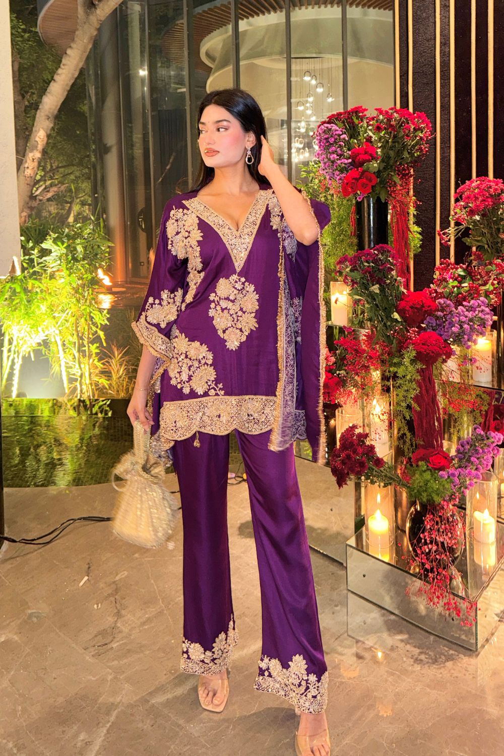 Draped in a maroon kaftan paired with matching pants, with the handwork adding a festive glow, the outfit offers a balance that is a treat, whilst making it perfect for a Diwali party with your friends! With its rich fabric and luxe detailing, it's for the woman who embraces style while still honoring her roots.