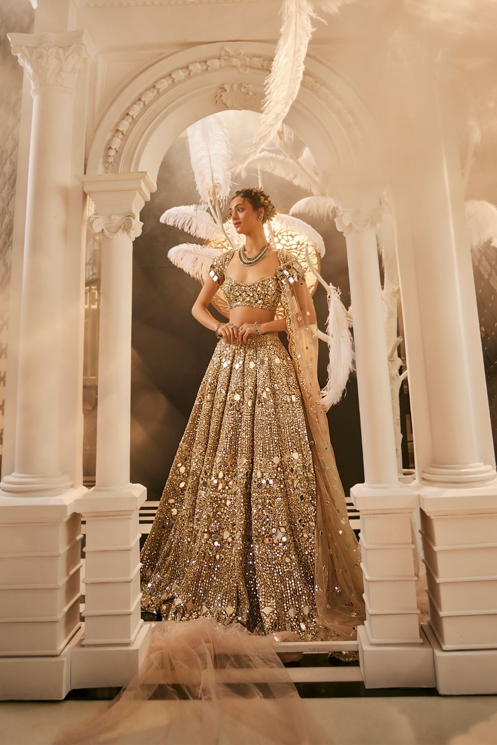 The moment she steps into the room, the golden lehenga commands attention. The net fabric, embellished with intricate mirror work, creates a stunning play of light and texture that feels both beautiful and otherworldly. The lehenga’s dramatic trail flows behind her like a river of gold, adding an element of grandeur with every step. The wide sweetheart neckline of the blouse, paired with the trail, rich with the same exquisite detailing, completes this show-stopping look for an unforgettable day.