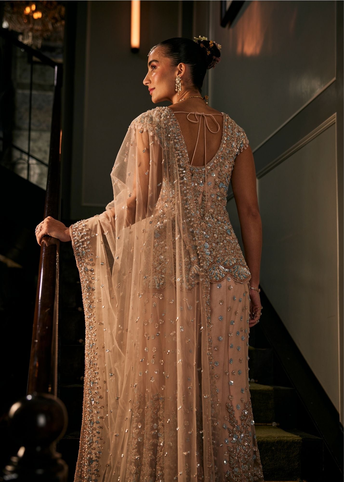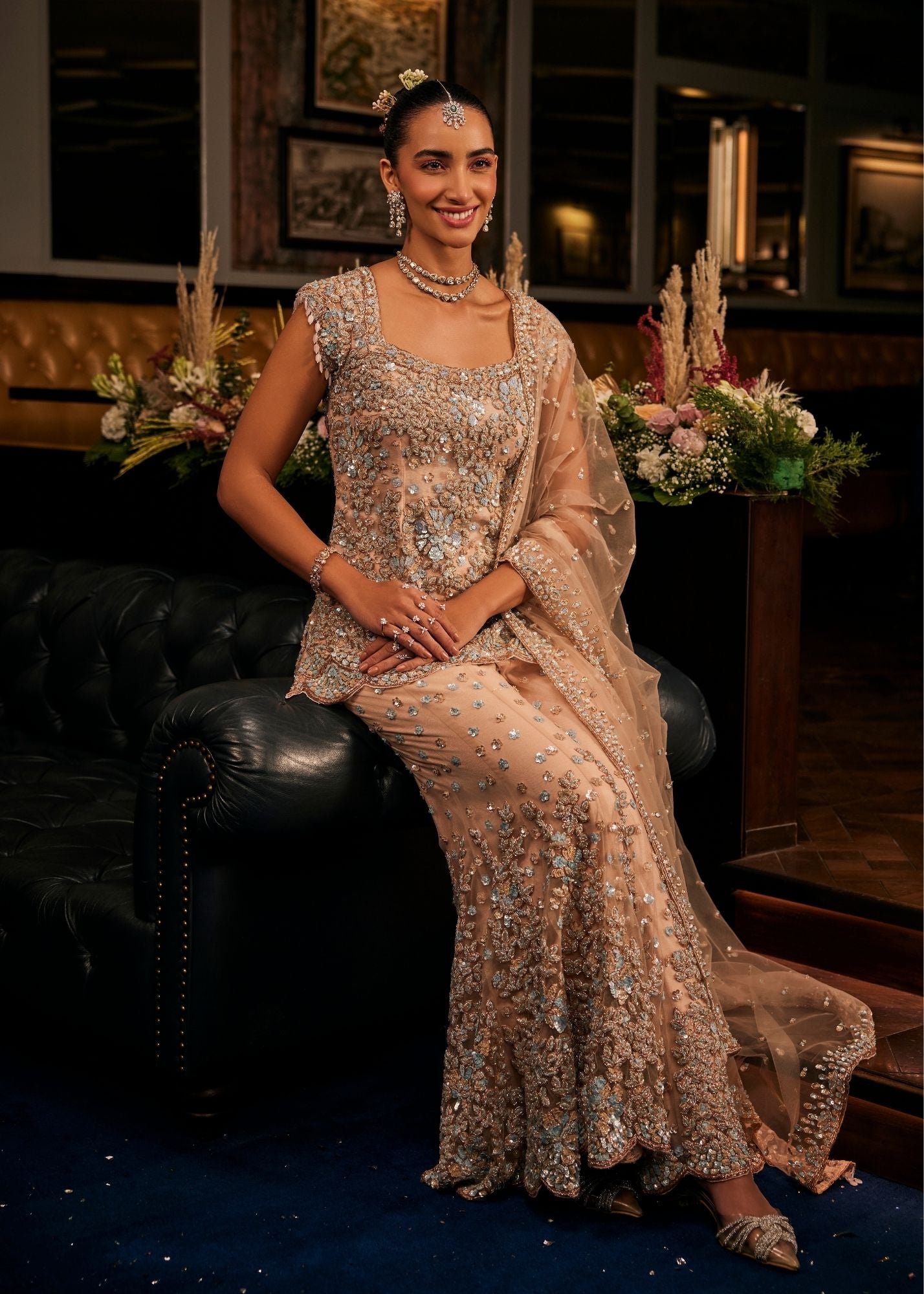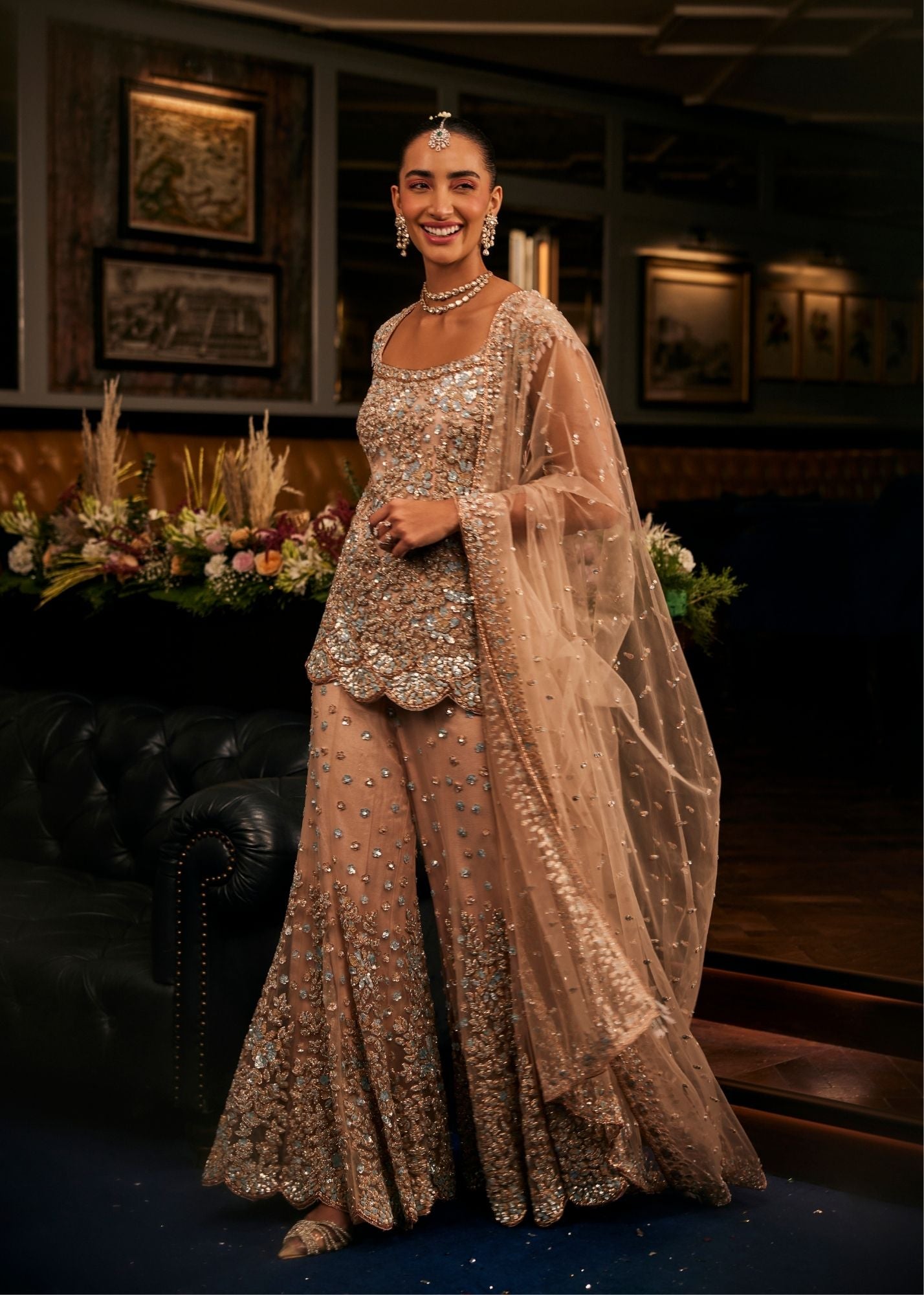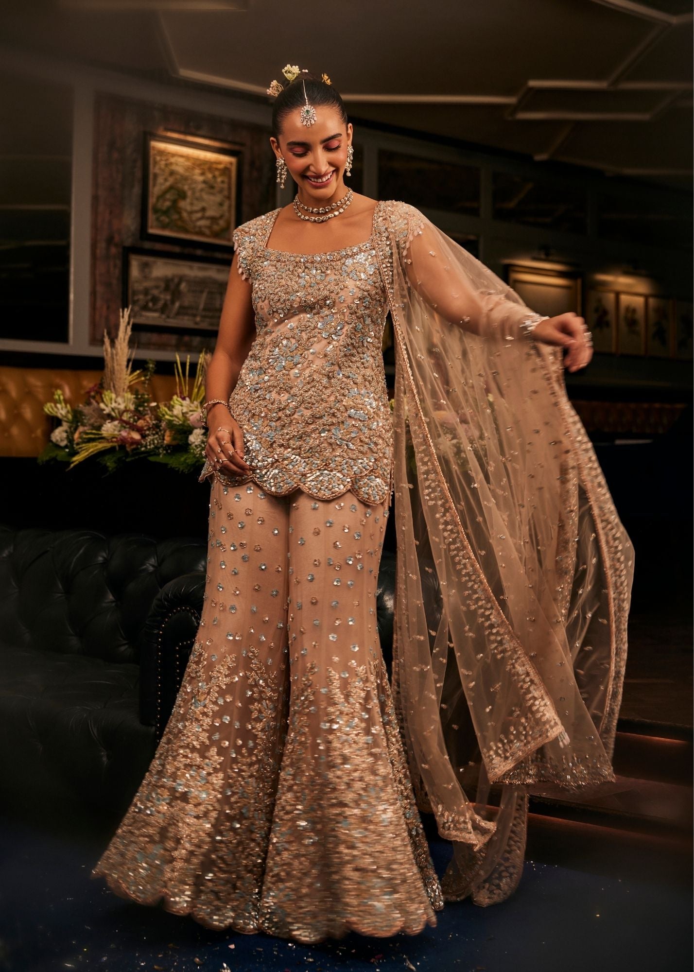 The blush peach, soft as a whispered secret, lends this sharara an air of timeless romance. The flowing net and cape sleeves drift with every movement, creating the illusion of petals in bloom. A square neckline frames the look with understated elegance, while hand embroidery shimmers gently, like light dancing across calm waters. An ensemble woven for celebrations that feel intimate yet eternal, where every glance holds the warmth of love.