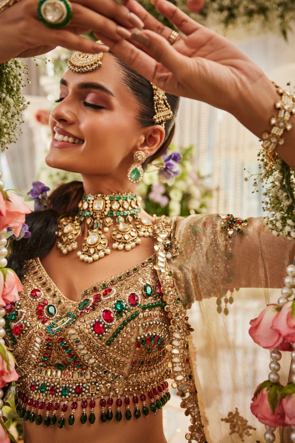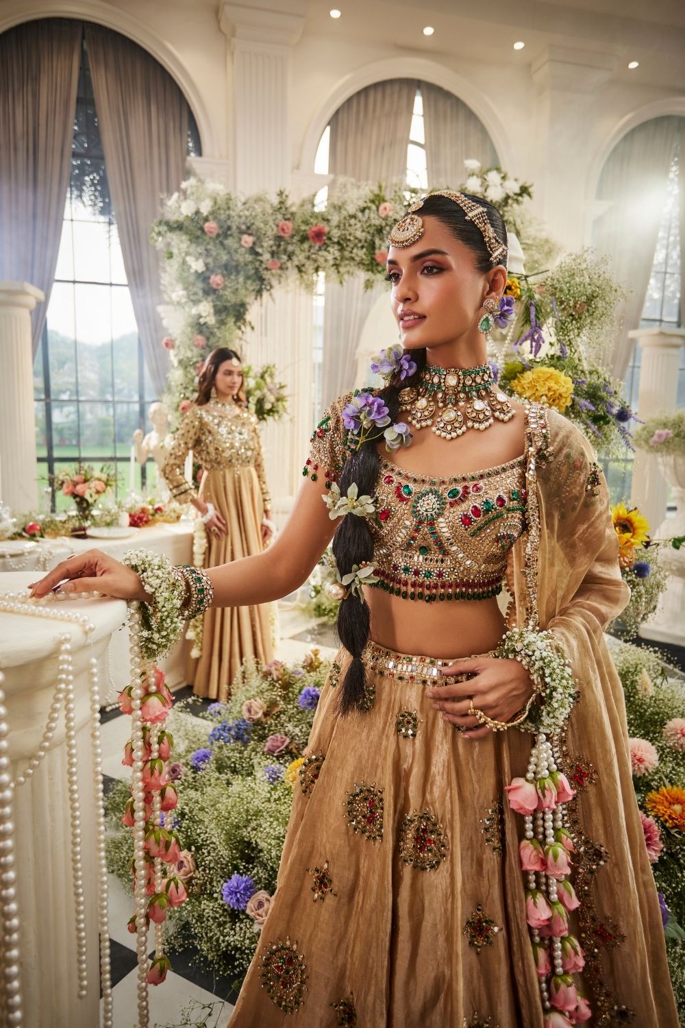 The cape sleeves steal the spotlight first ~ fluid, airy, and full of movement, they bring an effortless drama to this gold lehenga set. The blouse sparkles with stones, adding a sculpted shine that is timeless. The tissue lehenga beneath catches the light in soft, glowing ripples, creating a silhouette that seems to float rather than fall. With the dupatta adding the final sweep of elegance, the entire look feels bright, uplifting, and made for a moment where celebration meets pure, sparkling joy.
