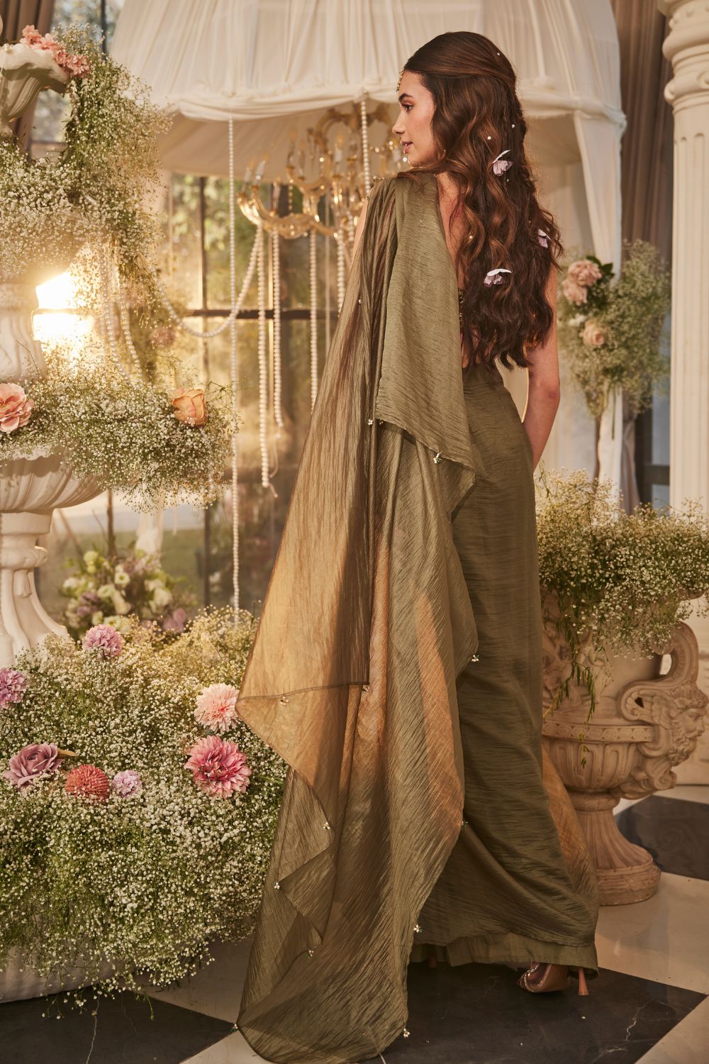 This olive-green skirt set brings a quiet, enchanting charm to the celebration. The deep sweetheart blouse shimmering with hand-placed jewel stones, its sleeveless silhouette adding a touch of modern ease. The tissue drape skirt flows around her like a soft swirl of light and movement, catching every glance with its effortless grace. A blend of elegance, warmth, and that intimate glow that makes the festivities feel even more beautiful.