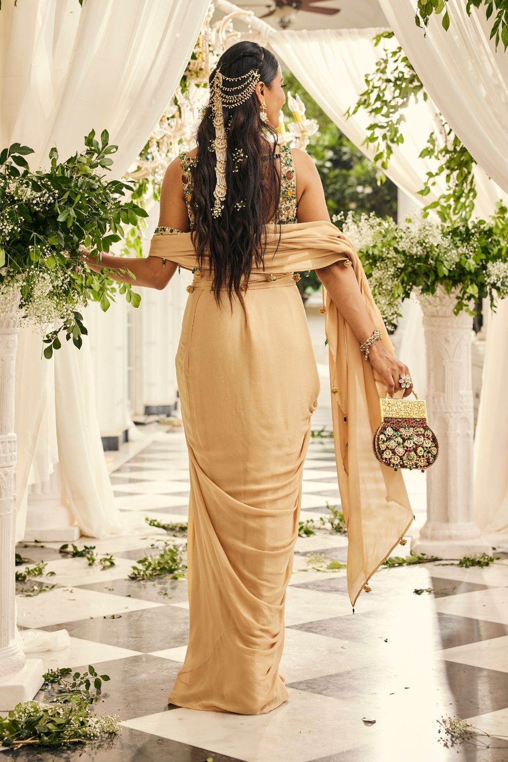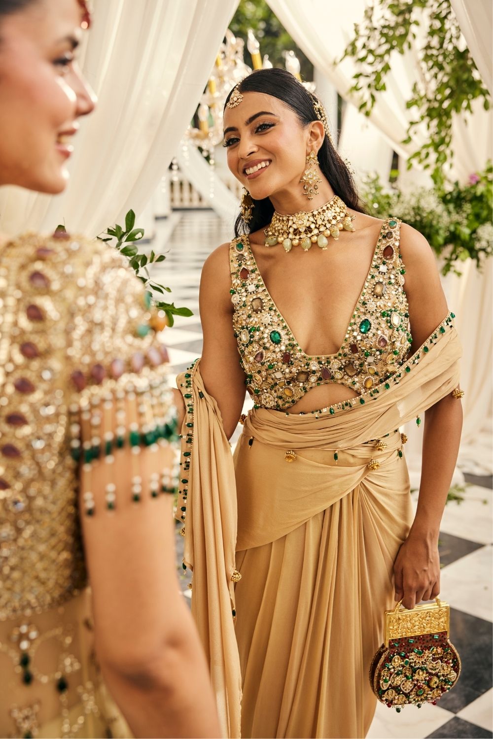 A vision in molten gold, this saree set flows like liquid light. The plunging glass neckline adds a daring edge, balanced by the fluid drape of tissue and pure crepe that glides with effortless grace. Jewel embellishments shimmer across its surface, hand-placed like constellations on a midnight sky. Majestic yet modern, it is crafted for the bride who wishes to embody both power and poetry, stepping into her moment with the brilliance of a goddess adorned in gold.