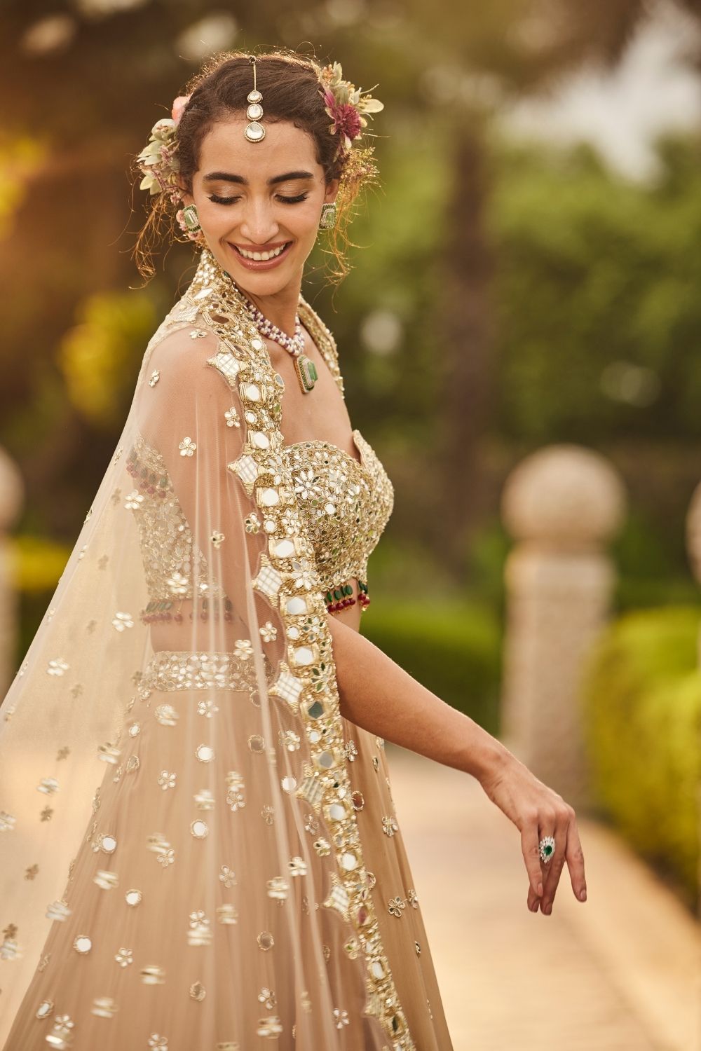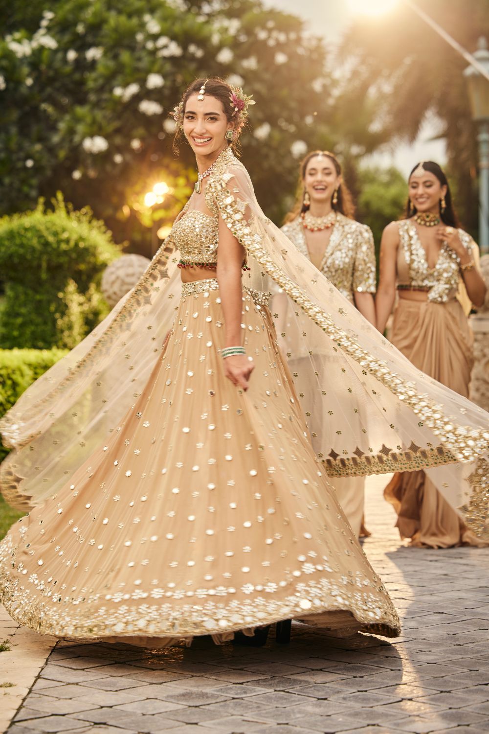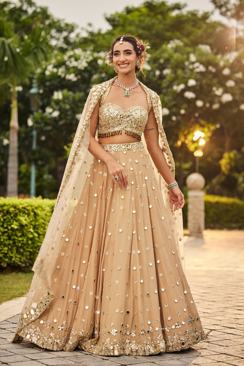 Gold has always carried the glow of festivity, and in this lehenga it shines like the heartbeat of celebration. Crafted in crepe and net, the silhouette drapes with effortless grace, catching light at every turn. Hand-embellished mirrors sparkle amidst scarlet and emerald accents, creating a dance of reflections that echo joy and togetherness. The sweetheart neckline adds a touch of softness to the luminous palette, making the bride radiant as she steps into her moment. This is a lehenga woven not just with fabric and mirrors, but with the brilliance of a story ready to be lived.