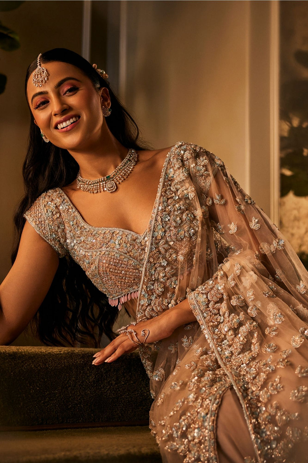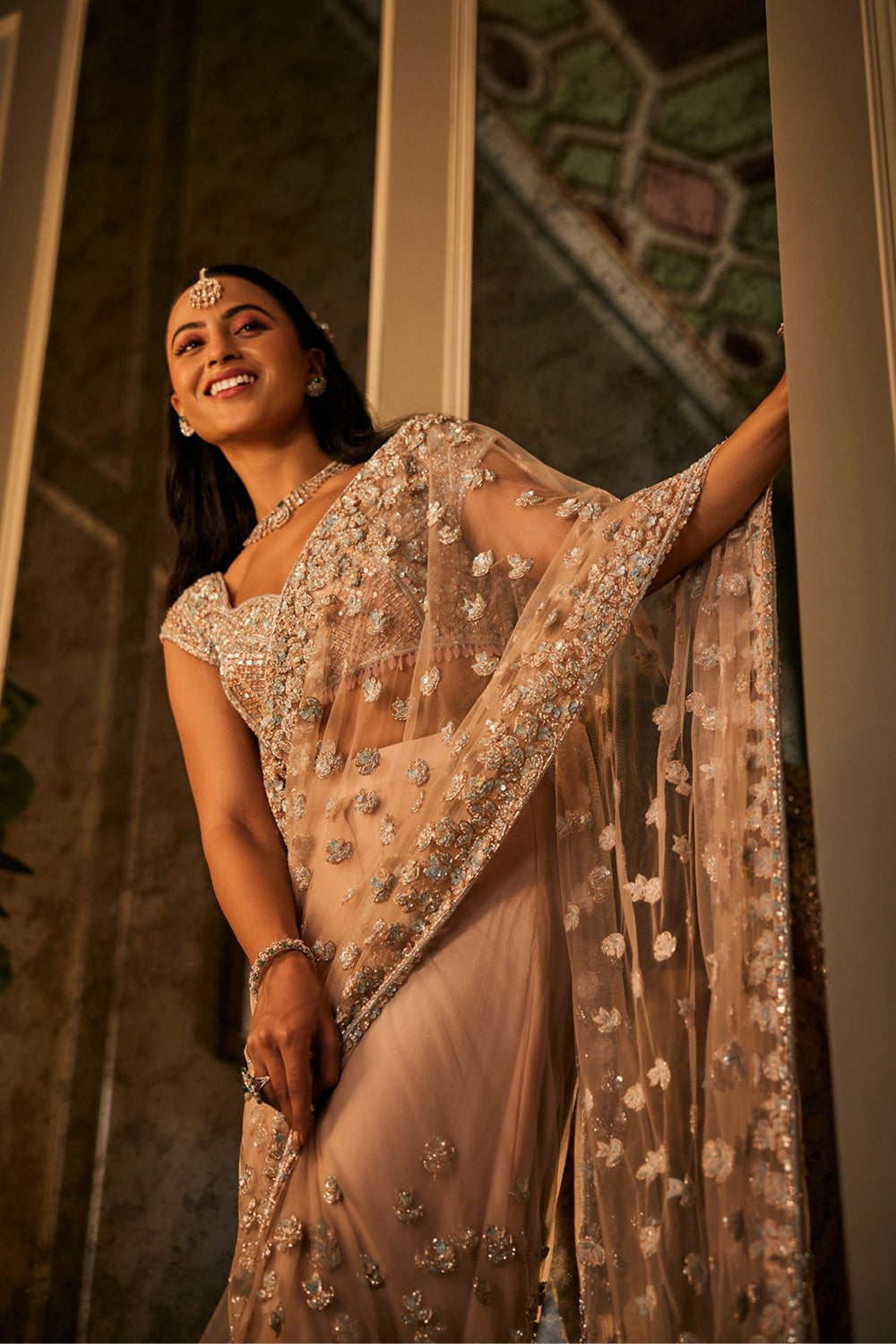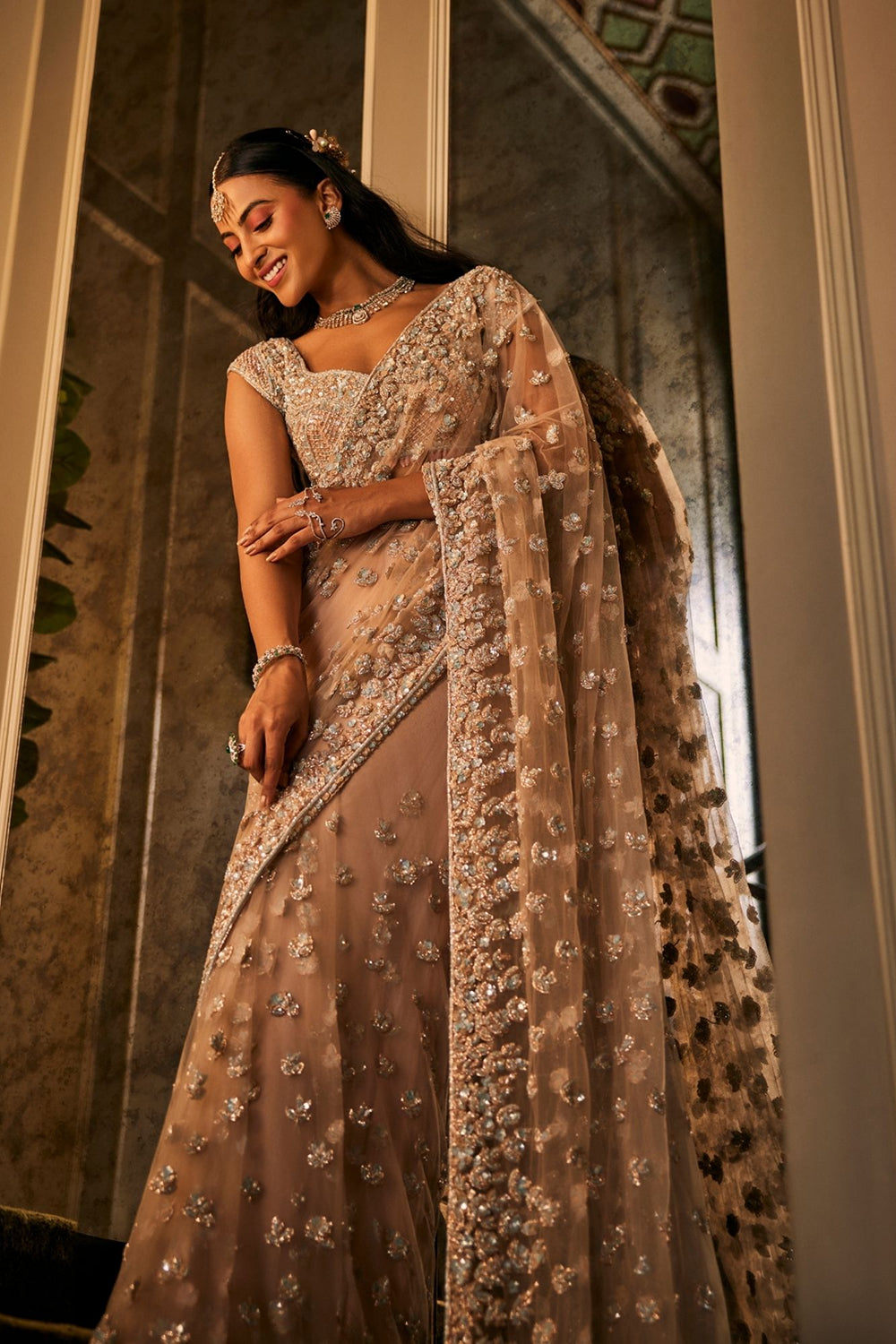 There’s a softness in the way dawn colors the horizon - gentle, ethereal, full of promise. This pre-draped saree in delicate net carries that same magic. With a sweetheart neckline and flowing cape sleeves, it drapes like poetry in motion, while hand embroidery glimmers like first light on quiet waters. An ensemble woven in romance, made for the bride who wishes to look like a dream unfolding.