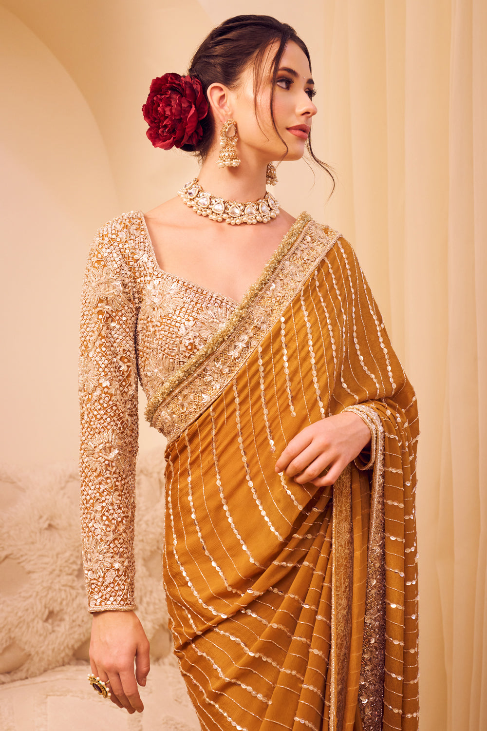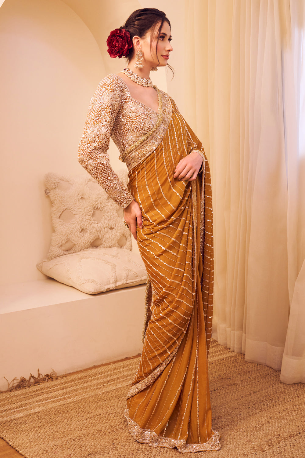 She drapes herself in the resplendent saree, its intricate details weaving a story of timeless sophistication. Paired with a glam blouse that shimmers with 84 tassels, she becomes the epitome of grace and glamour!