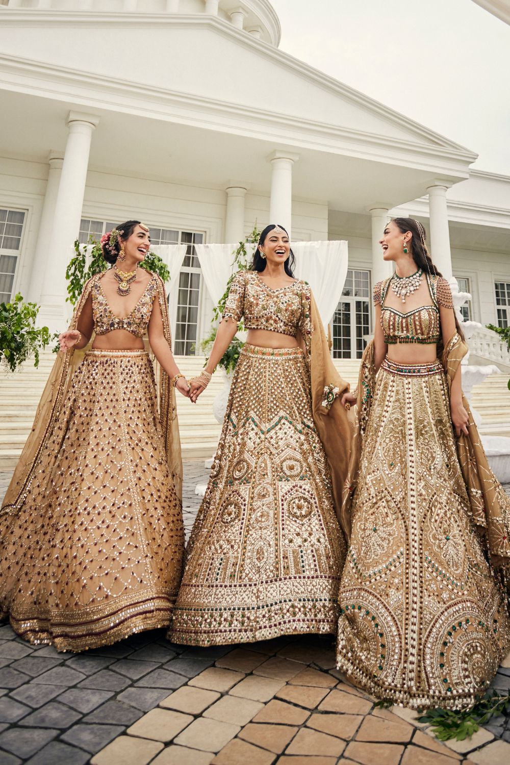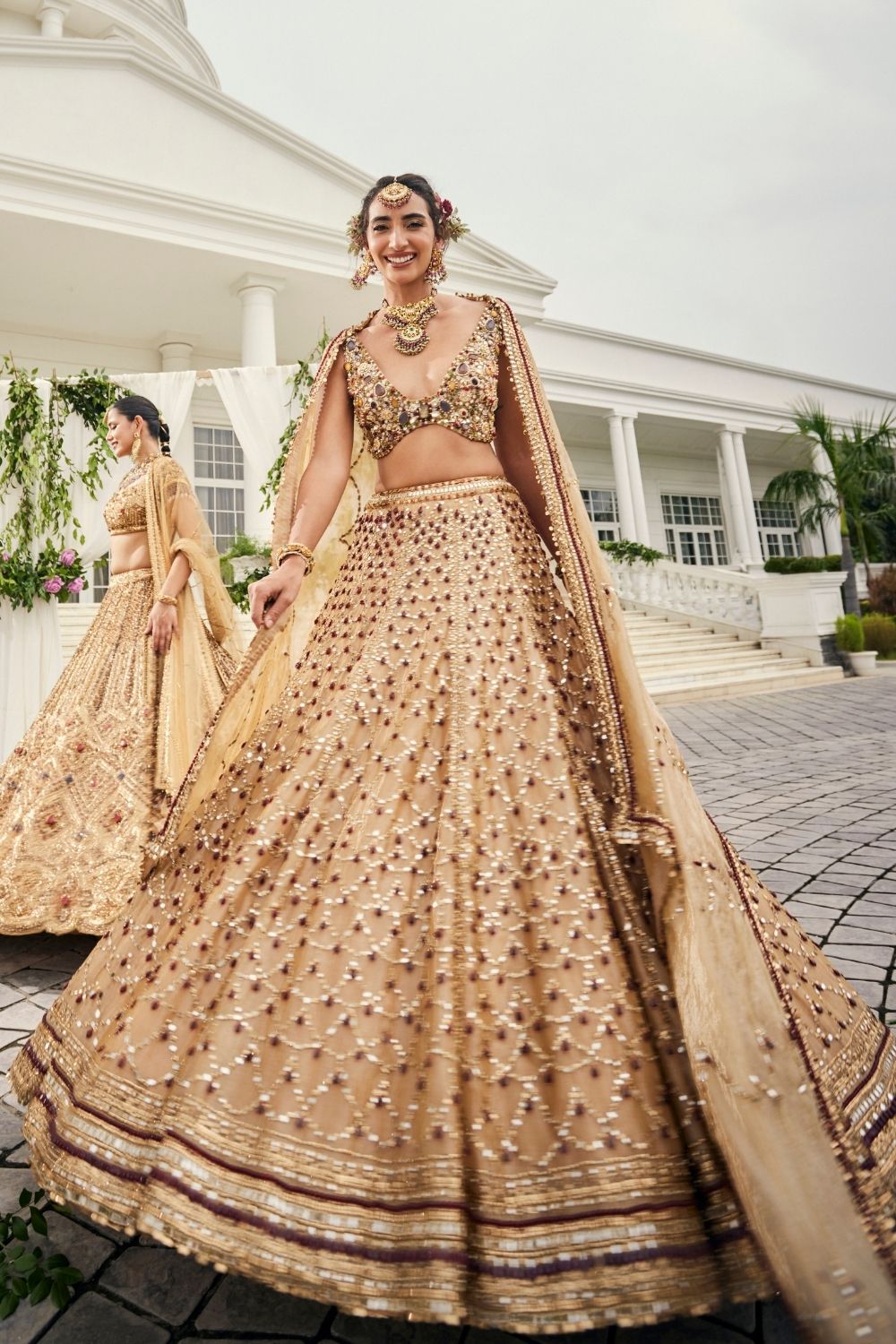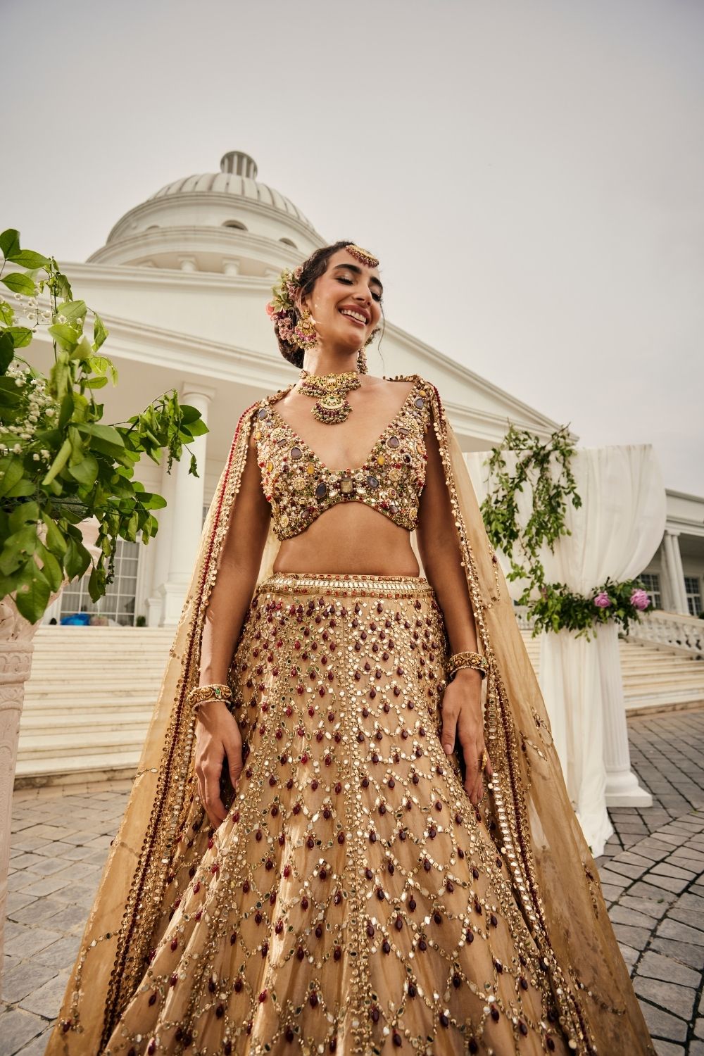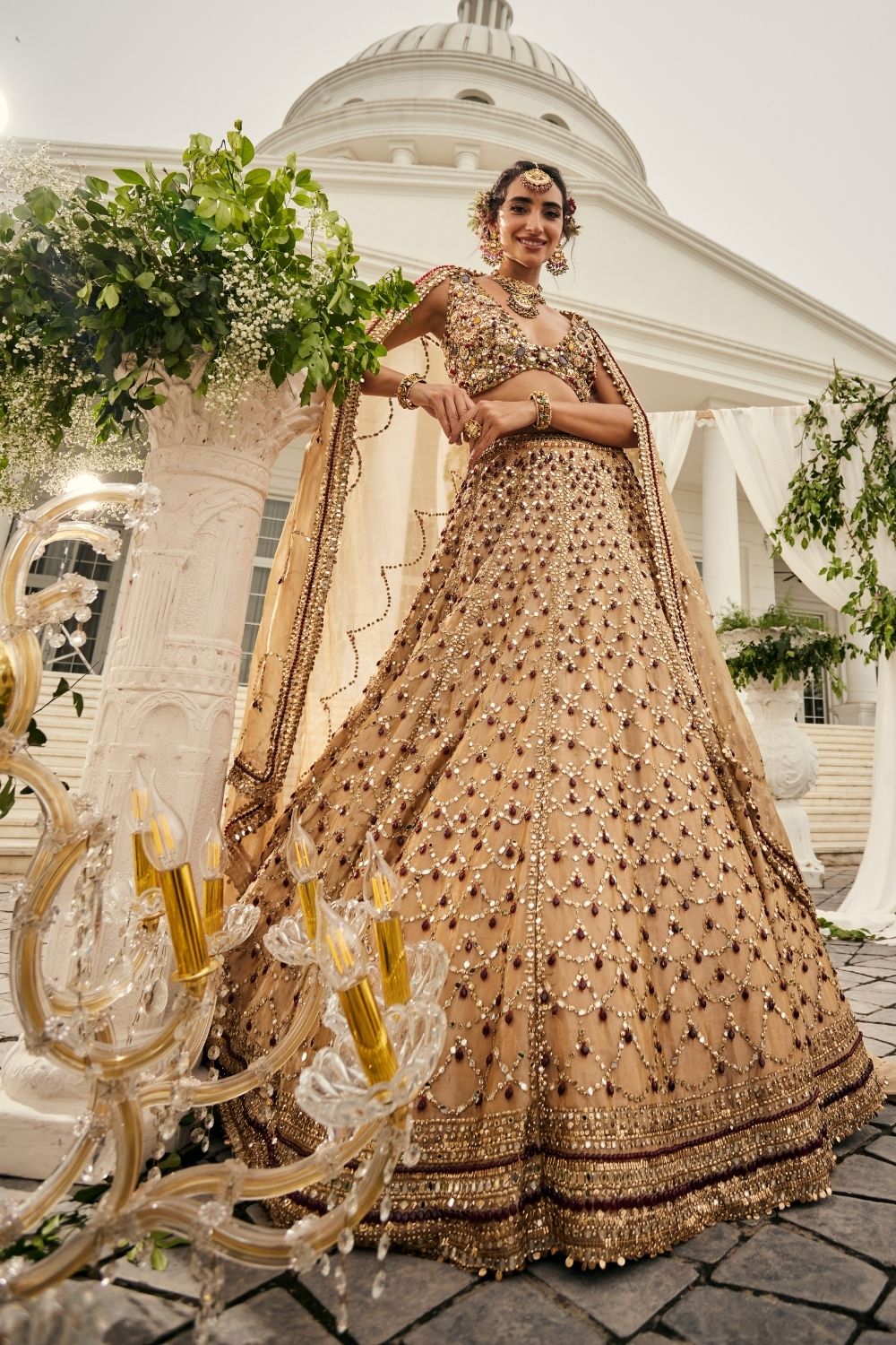 There are ensembles that dazzle, and then there are those that feel almost ethereal, like they were woven from light itself. This bridal lehenga in shimmering gold tissue carries that rare magic, its surface jeweled with scarlet and emerald hand embellishments that glow like scattered stardust. The glass neckline adds a touch of delicate wonder, blurring the lines between tradition and dream. As she steps forward, the lehenga moves with her, weightless yet powerful, as though it were spun only for this moment. It is the chapter where the bride becomes timeless-grace captured in gold.