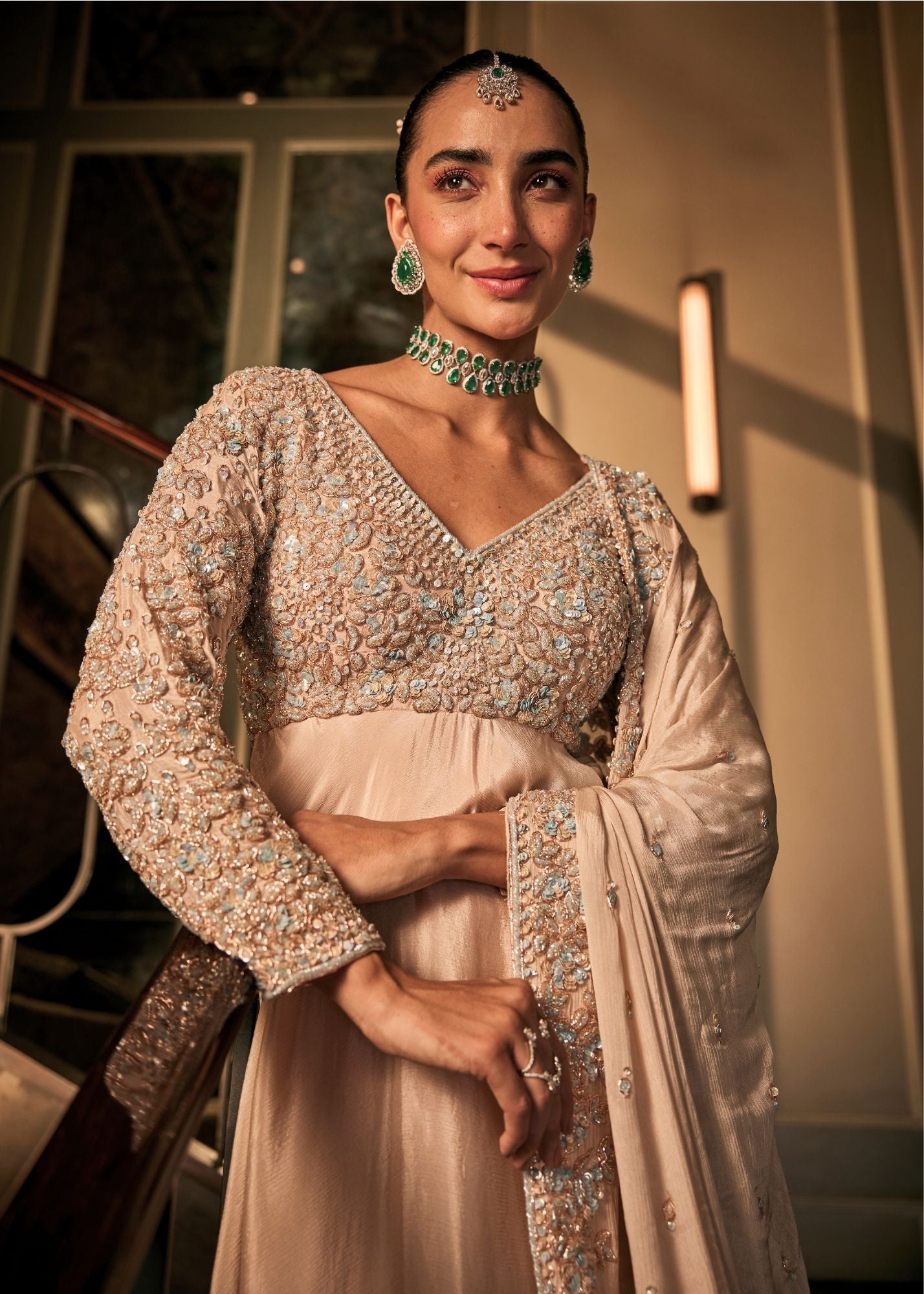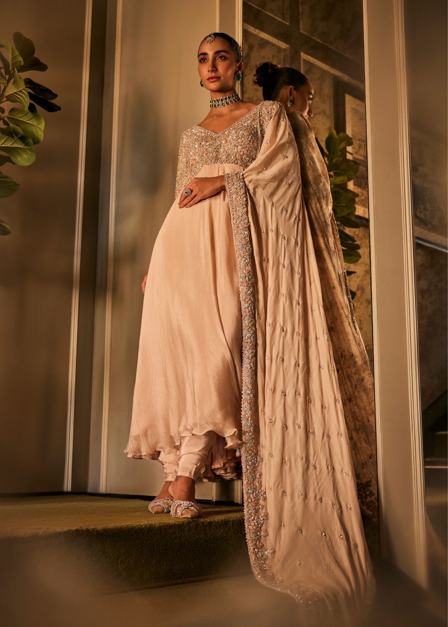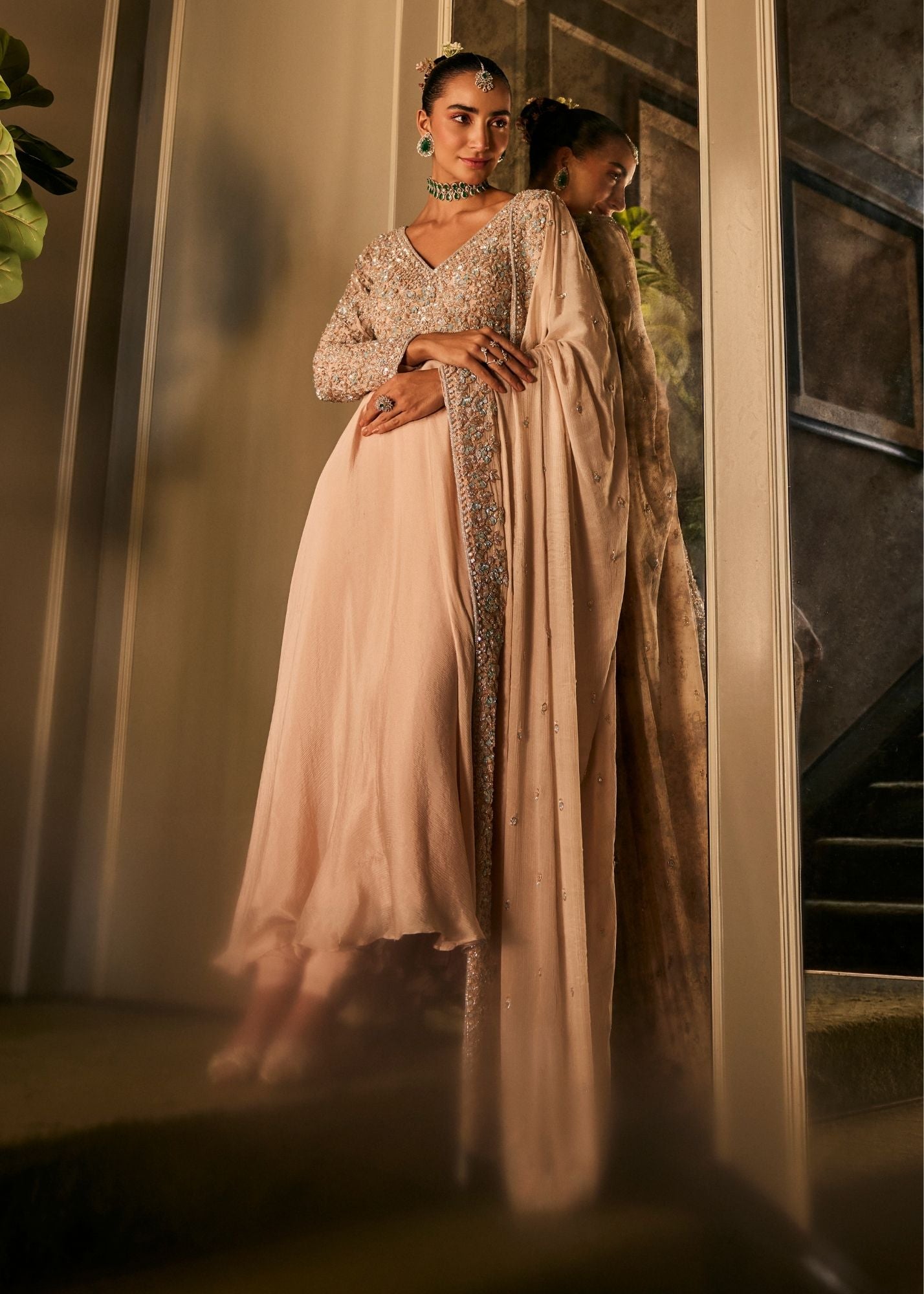 When the bride’s circle gathers, adjusting bangles and exchanging soft laughter. This blush peach Anarkali mirrors that moment - calm yet expectant. The chinnon fabric drapes with ease, its hand embroidery catching the light like little sparks of joy. With a flattering V neckline and full sleeves, it’s an ensemble that carries grace through every twirl, made for the stories that begin before the spotlight finds you.