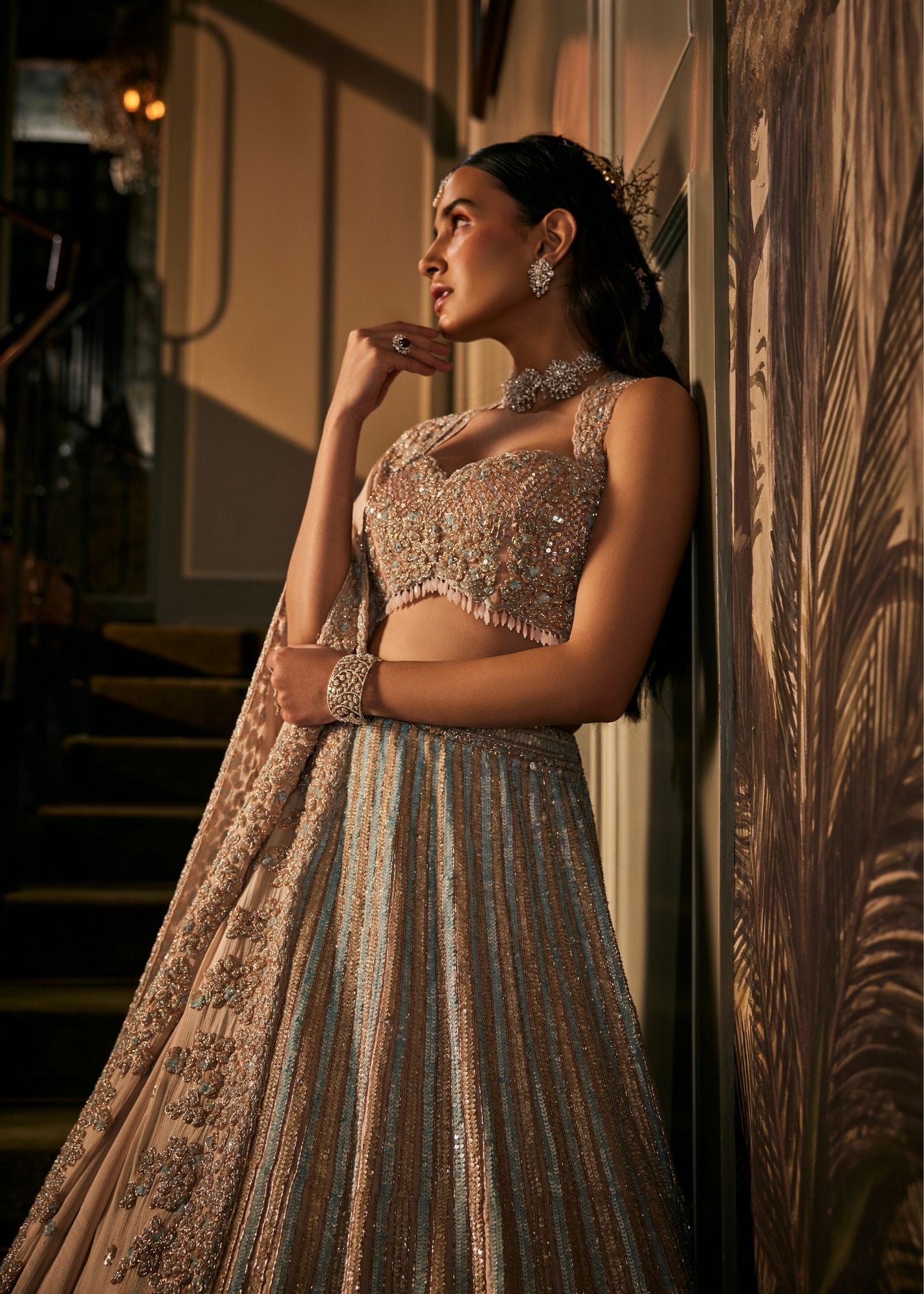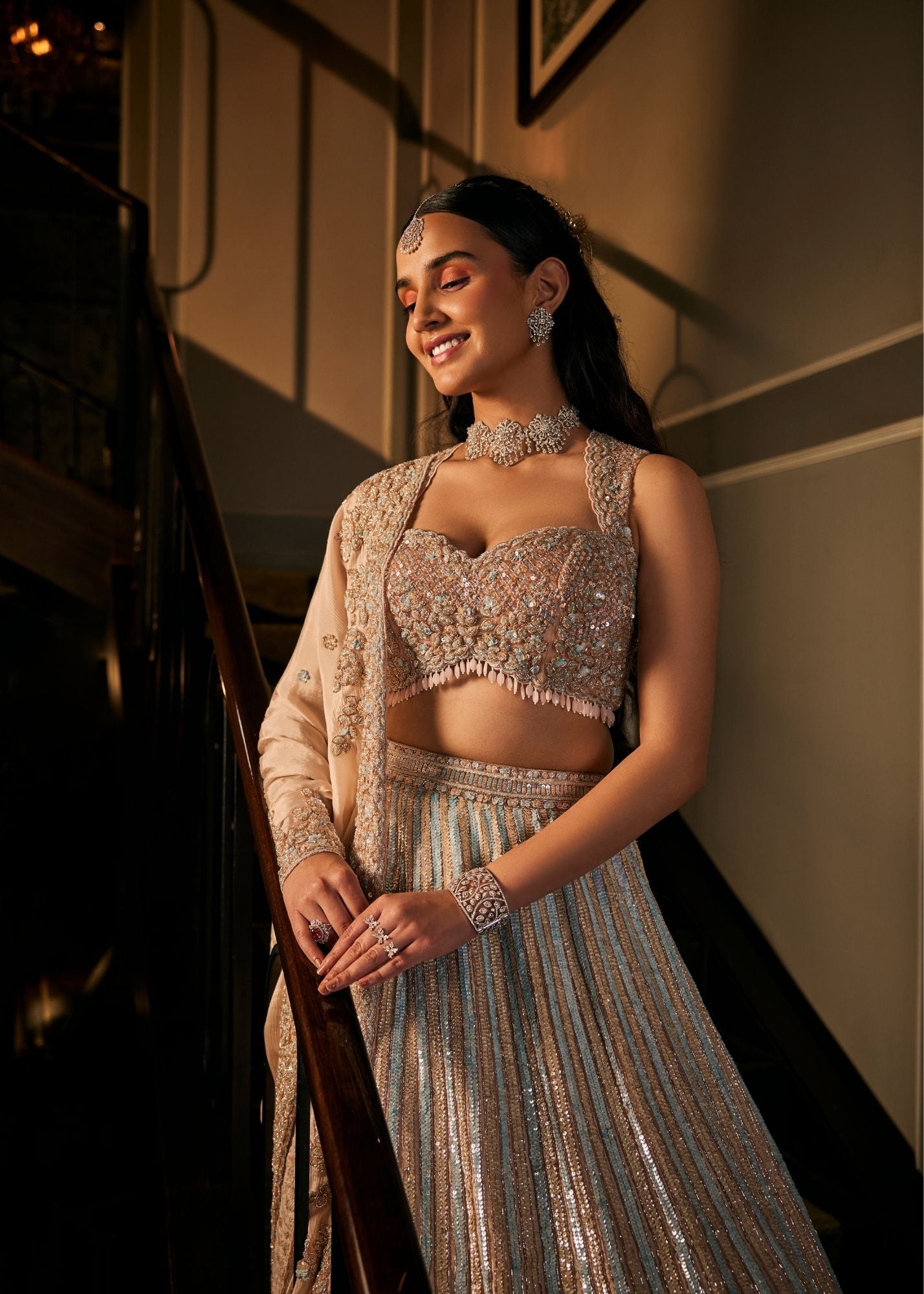 Blush peach holds the beauty of love’s first bloom ~ soft, radiant, and full of quiet wonder. This lehenga, crafted in layers of net, chinnon, and raw silk, moves like a gentle tide, flowing with every step. The sweetheart neckline and sleeveless cut bring a touch of effortless grace, while hand embroidery glistens like stars scattered across a twilight sky. An ensemble that feels like a love story written in fabric, meant for moments where the heart speaks louder than words.