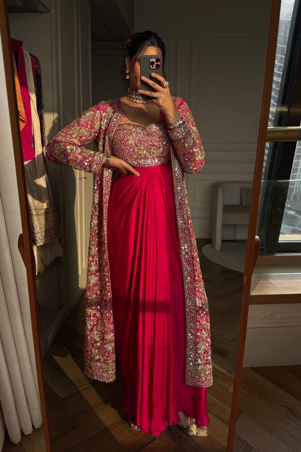 Vibrant and bold, the hot pink drape skirt set is a celebration of beauty with a contemporary twist. Adorned with intricate work the ensemble sparkles with every movement. The full-sleeved long jacket, paired with a sleek round-neck blouse, adds a layer of structured sophistication, while the drape skirt flows gracefully, creating a silhouette that’s both dynamic and refined.