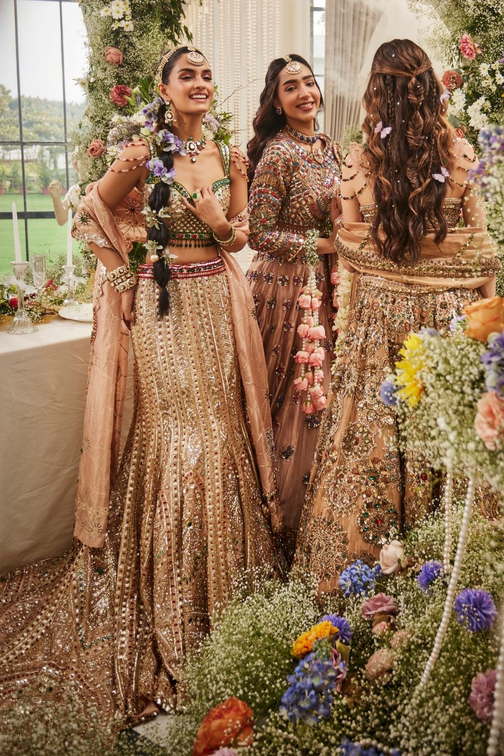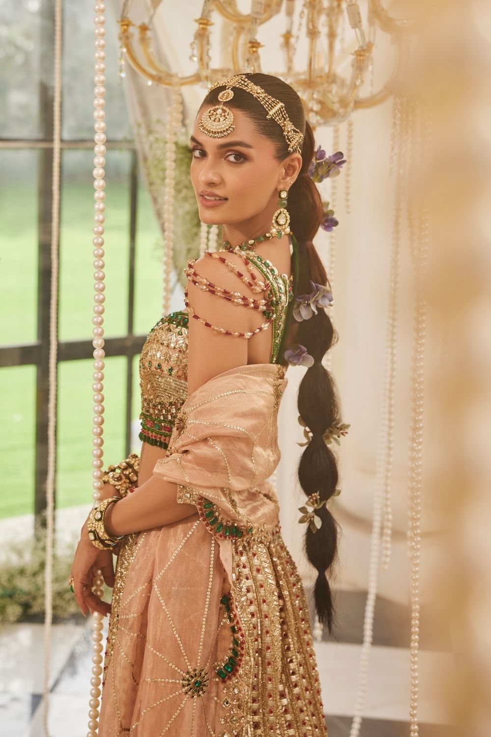 The gold tissue lehenga is all about movement, light glistening off it and full of that celebratory sway that instantly draws the eye. Its sweetheart blouse, sleeveless and sparkling with jewel, adds a bright, modern glow that feels joyful rather than formal. The dupatta then slips into the look with an easy softness, balancing the shimmer with a graceful touch. Together, the ensemble feels uplifting and luminous, the kind of gold that doesn’t overpower, but instead wraps her in a warm, glowing confidence the moment she steps in.