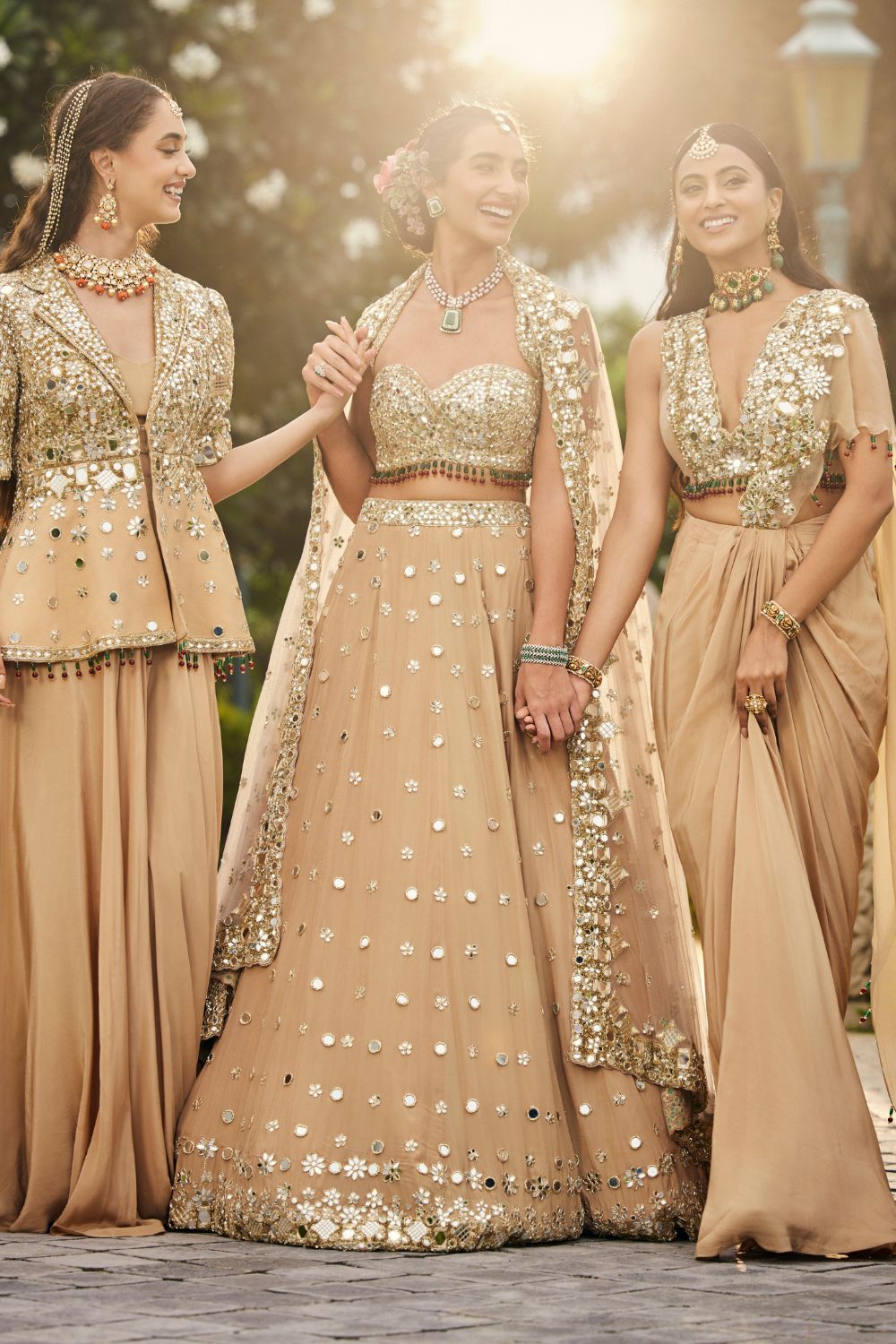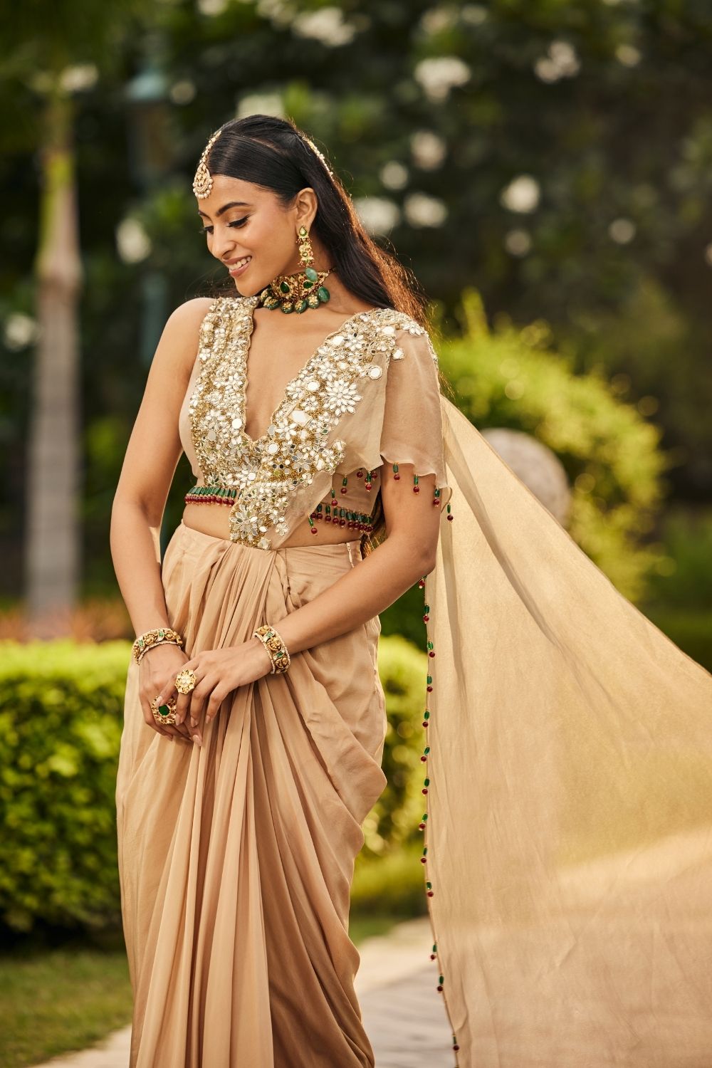 There are outfits that shimmer, and then there are those that feel like they were born from light itself. This pre-draped saree is one such piece, flowing in molten gold, as effortless as a dream. Mirrors catch and scatter the glow, turning every movement into a dance of reflections, while scarlet and emerald accents whisper of blessings hidden in the folds. The plunging neckline adds a quiet boldness, a reminder that a bride’s radiance is not only in tradition but also in the fire she carries within. This saree is not just worn, it becomes her-fluid, fearless, unforgettable.