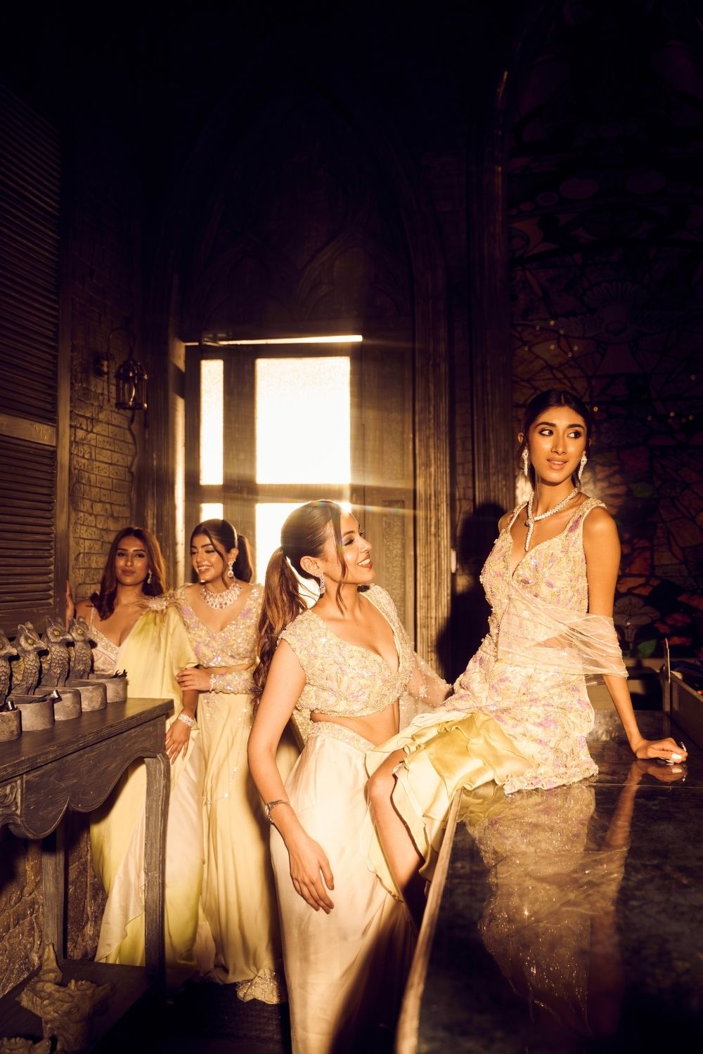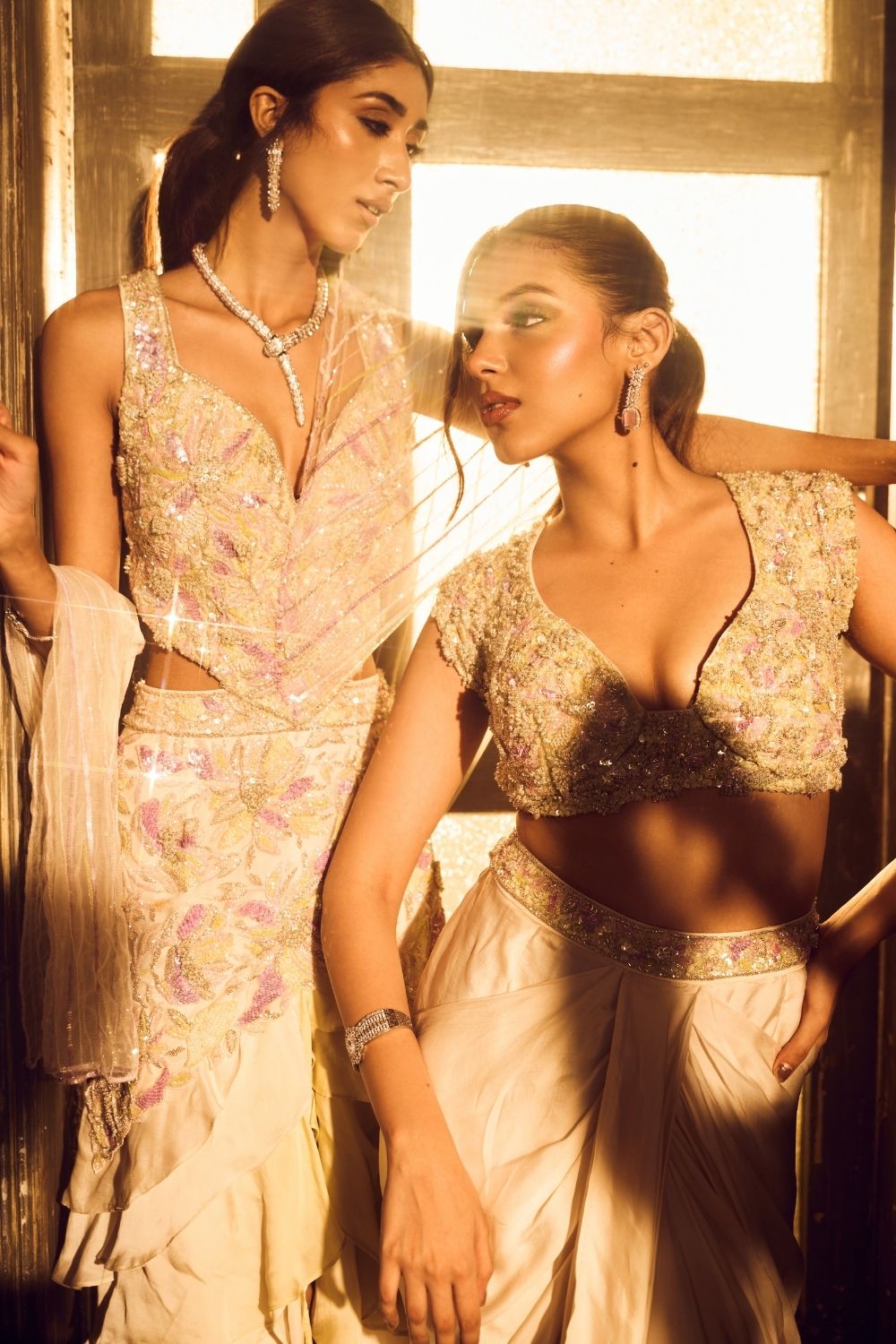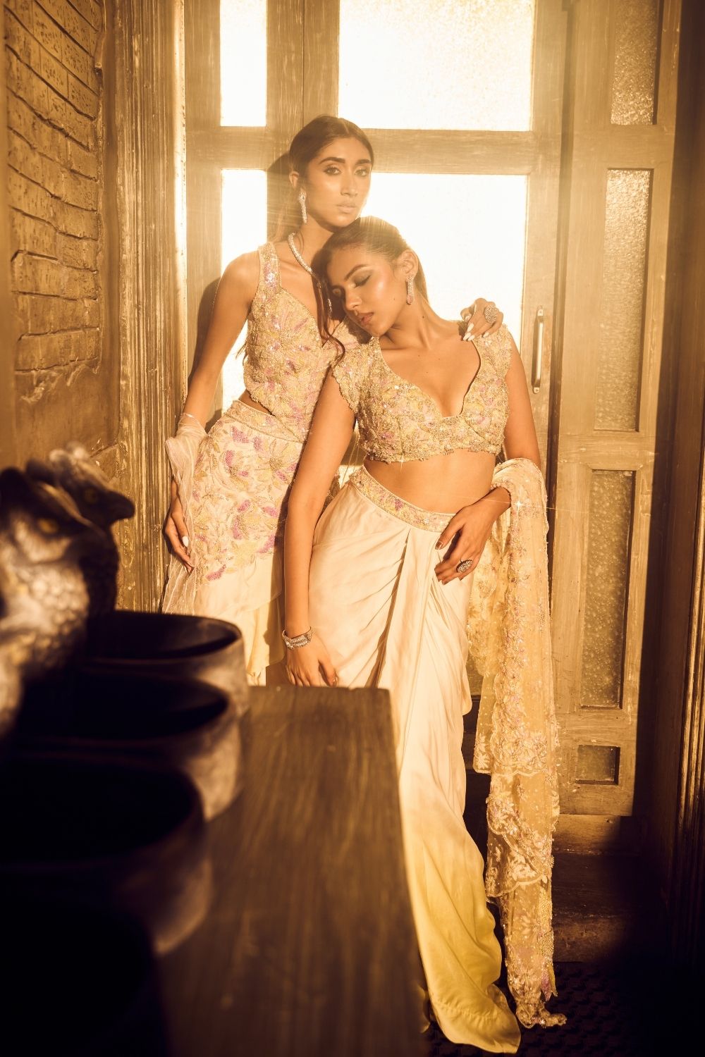 A fusion of cultures stitched into every thread, this ombré green dhoti and embellished top reimagine the classics with a contemporary soul. The intricate handwork tells a tale of craftsmanship, while the light fabric flows freely, making it easy to picture yourself at a daytime soirée or at an intimate mehendi function!